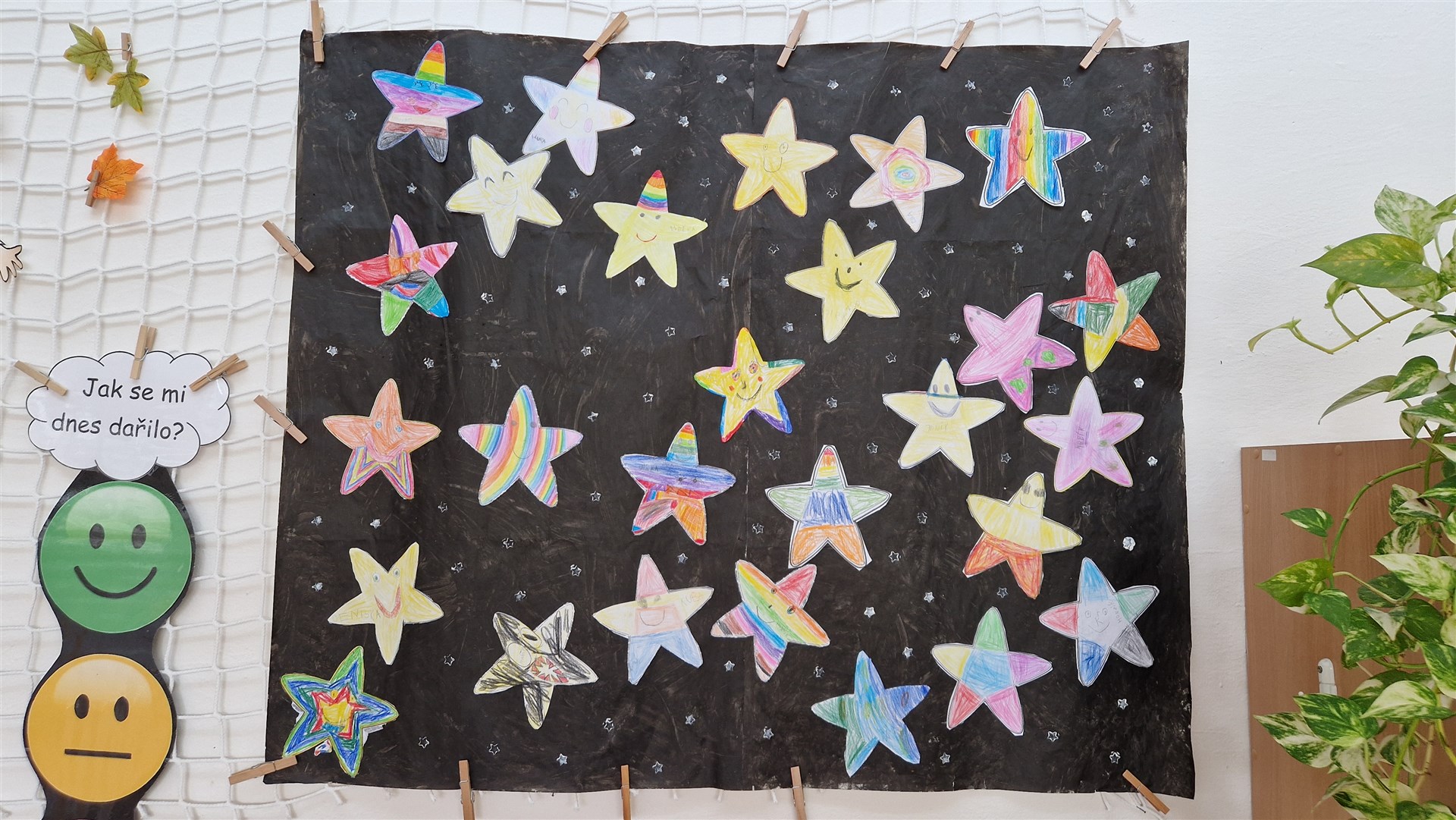 Ve čtvrtek 11. září jsme společně prožili 1. adaptační den. Navštívila nás naše školní psycholožka Eliška, vzájemně jsme se o sobě dozvěděli, co má kdo rád a jak jsme si užili prázdniny. Potom jsme se zamýšleli nad jednotlivými emocemi, které můžeme prožívat, zakreslovali je pomocí smajlíků a několikrát si zahráli hru "Na emoce". Na závěr jsme si poslechli pohádku "Malá osamělá hvězda" a každý si vybarvil svoji hvězdičku. Při výtvarné výchově dotvoříme hvězdnou oblohu, aby naše hvězdičky nebyly osamělé, ale měly kolem sebe další kamarády, se kterými je jim dobře.