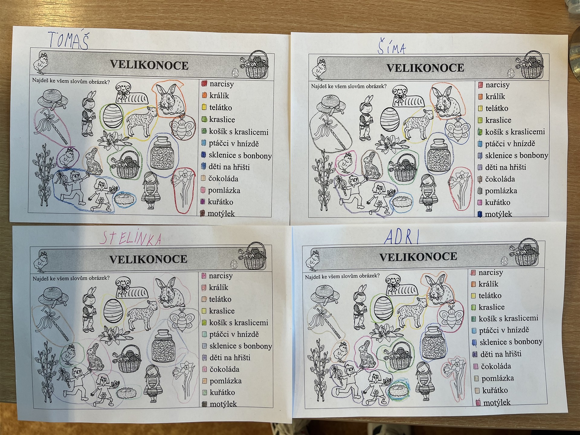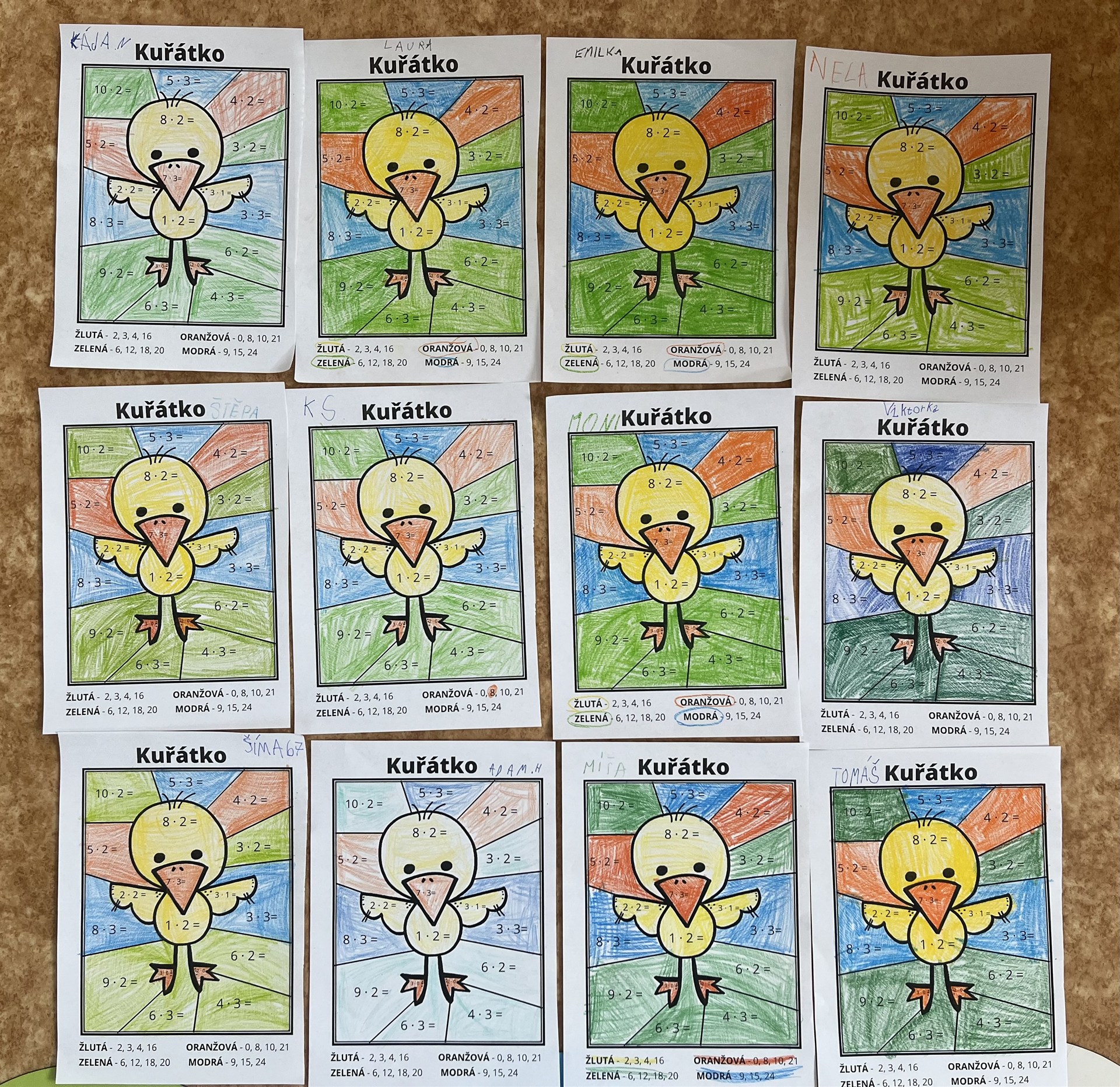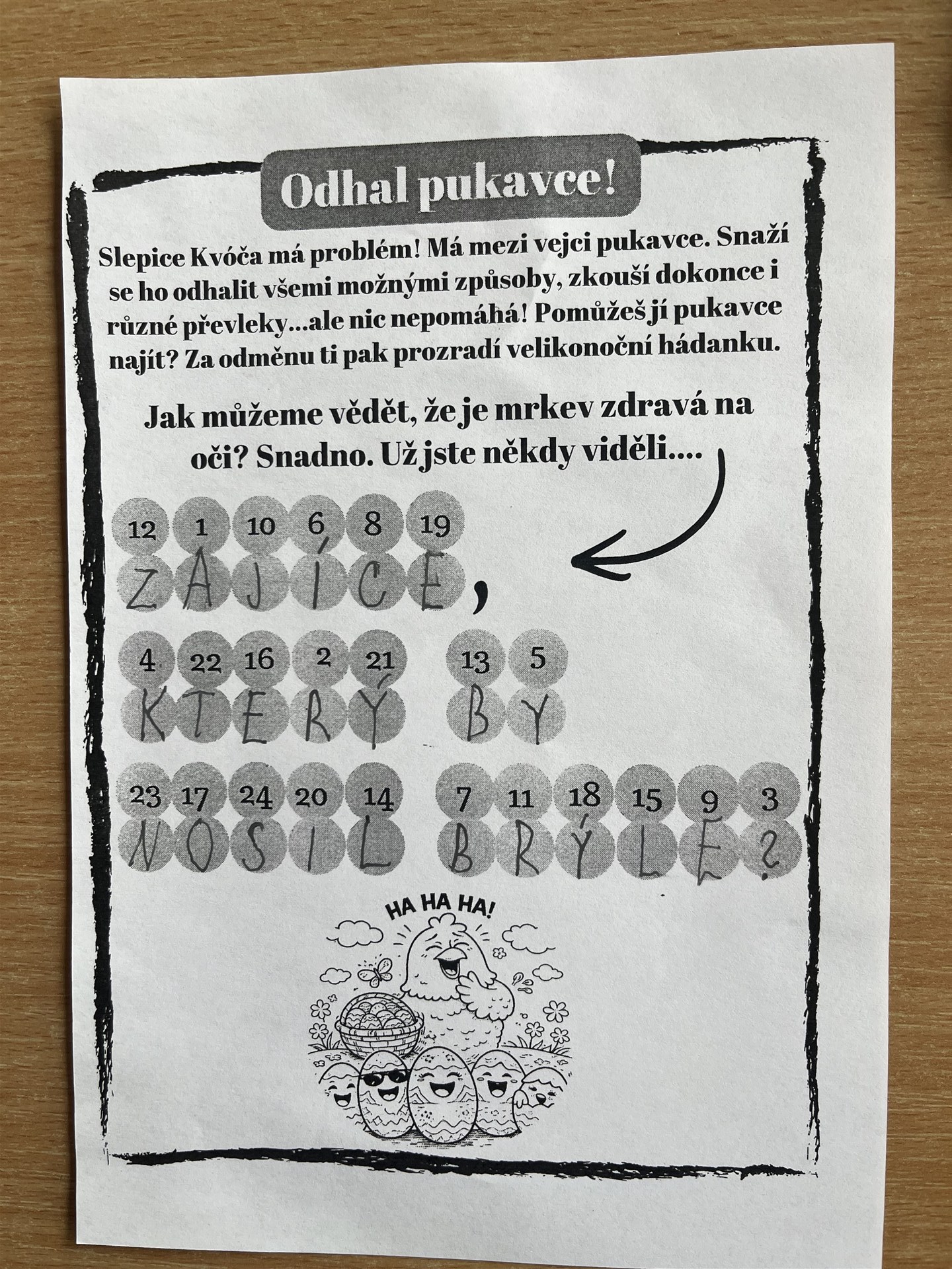 Dne 1. dubna jsme si propojili všechny naše znalosti z oblasti matematiky a českého jazyka a plnili celý den velikonoční úkoly. Nejdříve jsme rozklíčovali jednotlivé sváteční dny. Na interaktivní tabuli vyplnili pár záludných úkolů (osmisměrky, přesmyčky, doplňovačky, hádanky,...). Třetí hodinu jsme si zaskotačili v tělocvičně. Poslední hodinu jsme měli napilno, neboť jsme potřebovali stihnout deskovou hru na násobilku a také rozluštit pukavce slepičce Kvóče. Tajenkou byl vtip, kterému jsme se zasmáli: Jak můžeme vědět, že je mrkev zdravá na oči? Snadno. Už jste někdy viděli...ZAJÍCE, KTERÝ BY NOSIL BRÝLE?