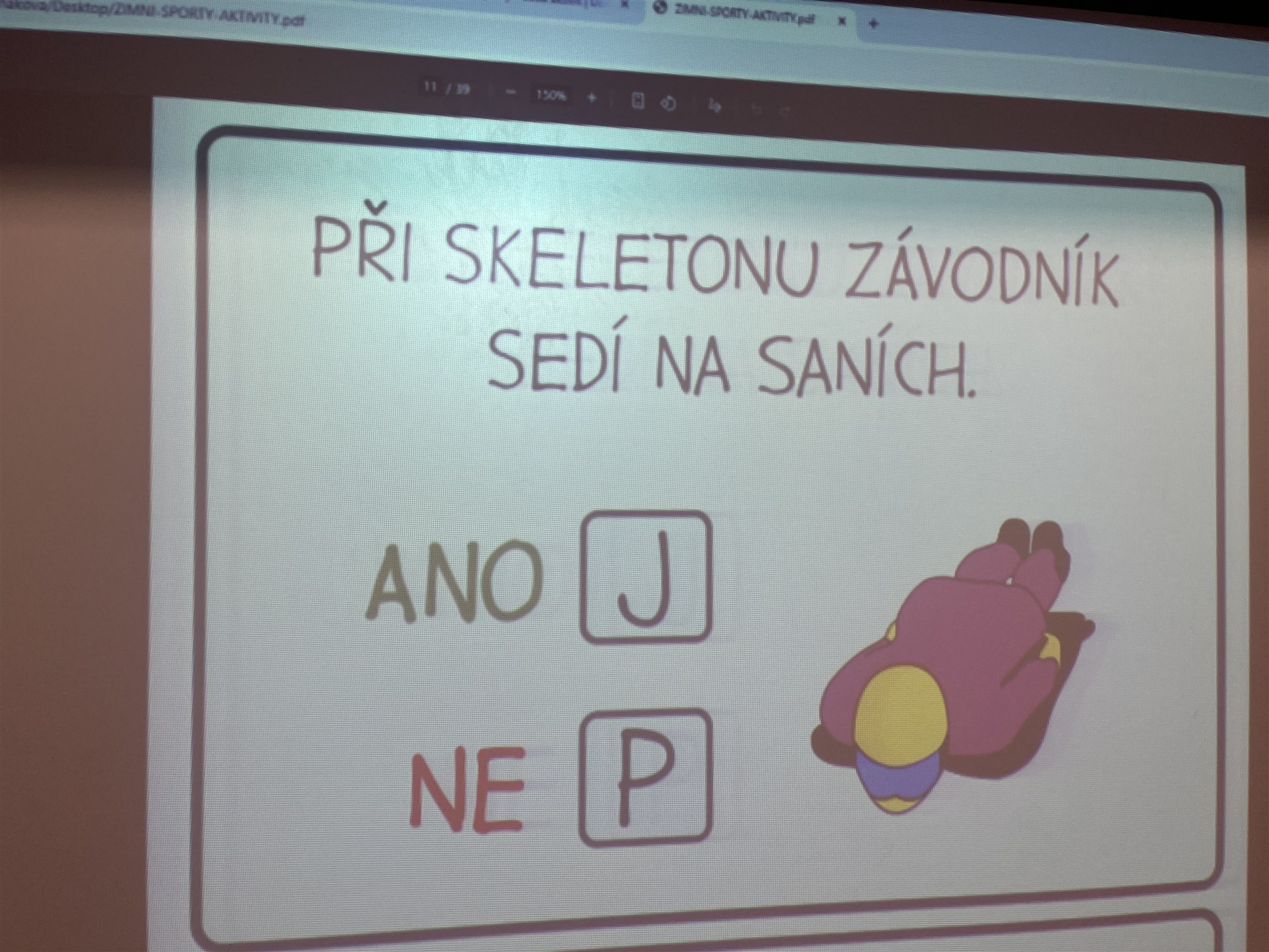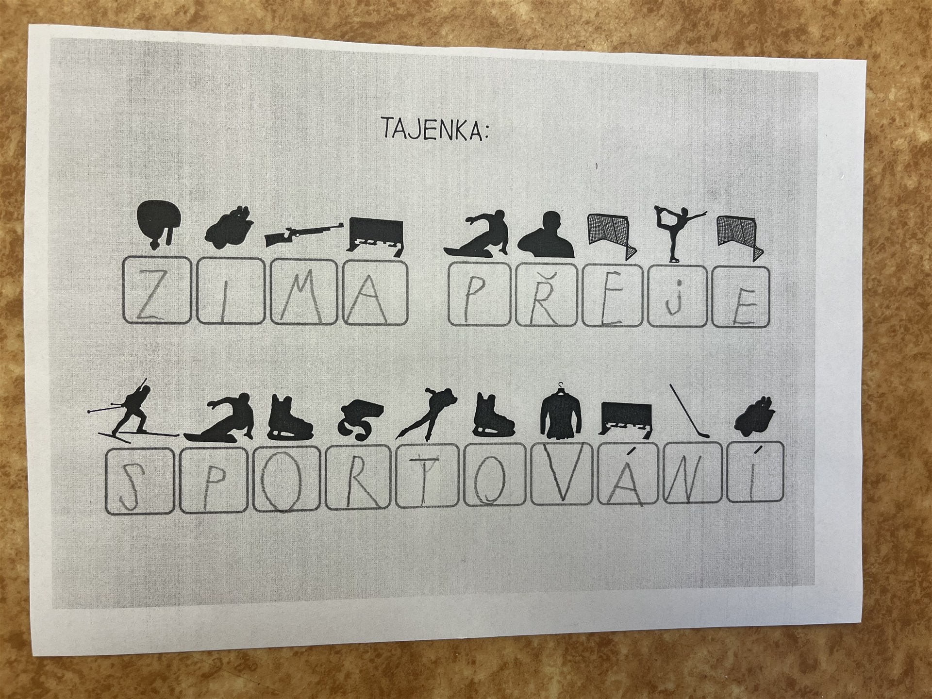 Dne 18. 2. jsme ve 2. A začali sportovní výuku hned od rána. Protože světem hýbe olympiáda, rozhodli jsme se ponořit do kvízů, které se nesly v duchu zimních sportů. Celé dopoledne jsme pracovali v týmech a plnili různé úkoly. Nesmělo chybět zopakování abecedy a třídění obrázků dle sportů. Hra Pomíchaná písmenka dala týmům ze začátku trochu zabrat, protože si žáci museli rozdělit role – pisatel, gumovač fólie, běžec a poradci. Číselné šifry jsme zvládli levou zadní. Hra Pravda a lež byla pro některé týmy obtížná, neboť byly zařazeny i sporty, které někteří neznali (např.: short track,…). Všechny tajenky žáci zvládli vyluštit a tady máte jejich řešení: Zima přeje sportování, Radost z pohybu a Lyžování. Výuku jsme zakončili příběhem Tajemství zdraví z Čítanky, který se nesl v duchu sportování – Moudří lidé praví, že v pohybu je zdraví! Po obědě se ještě pokračovalo ve školní družině. Dětem moc děkuji za krásnou práci, byl to hezký den!