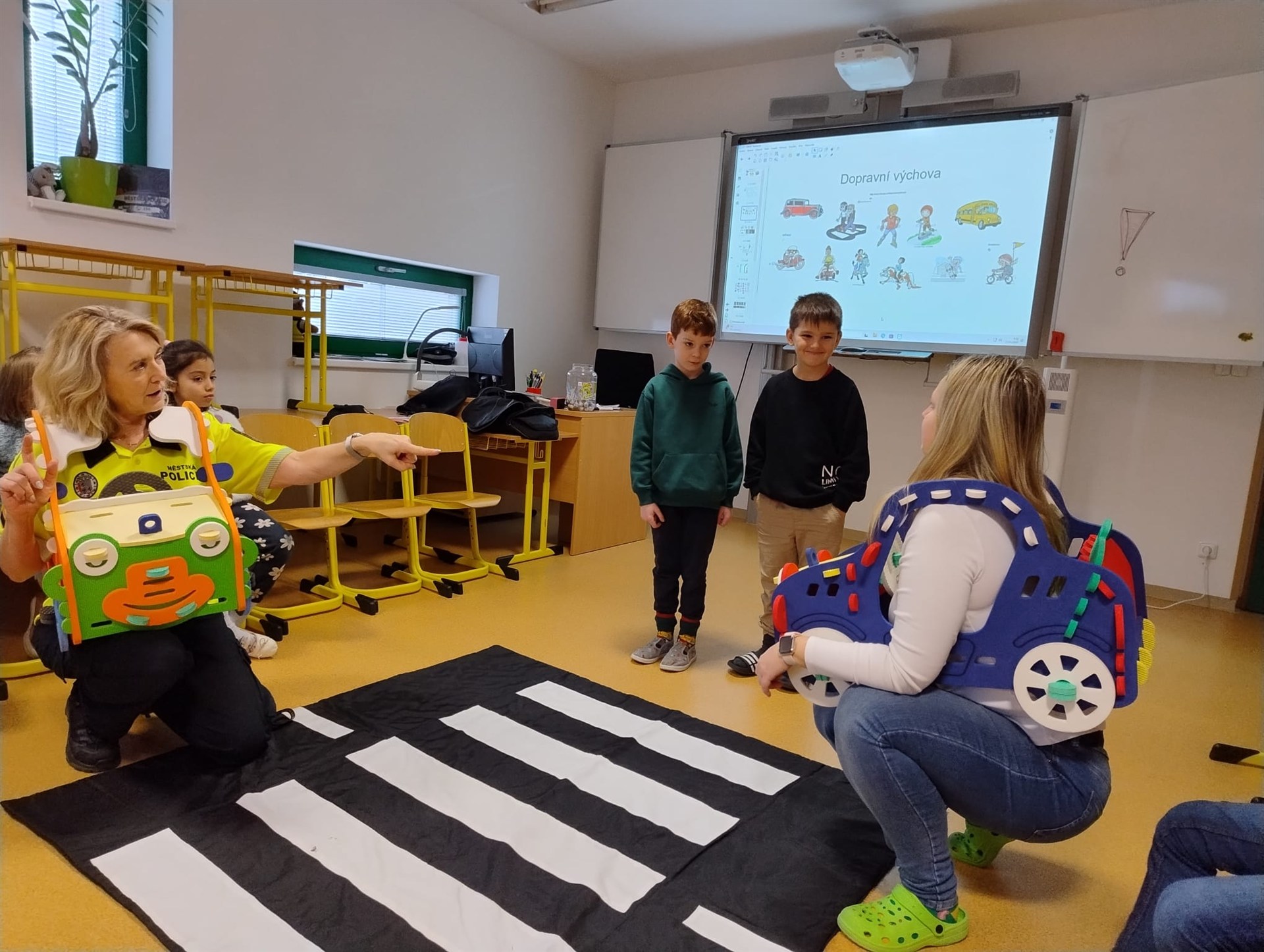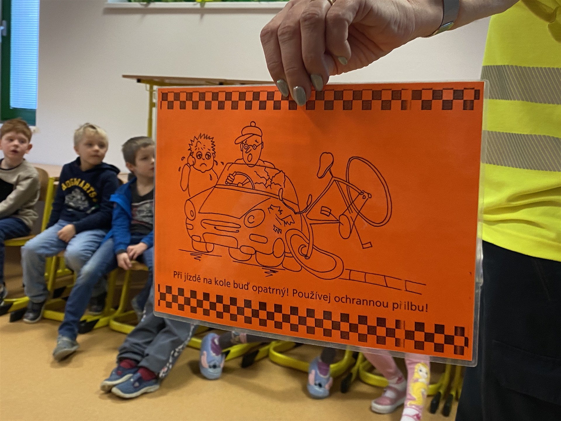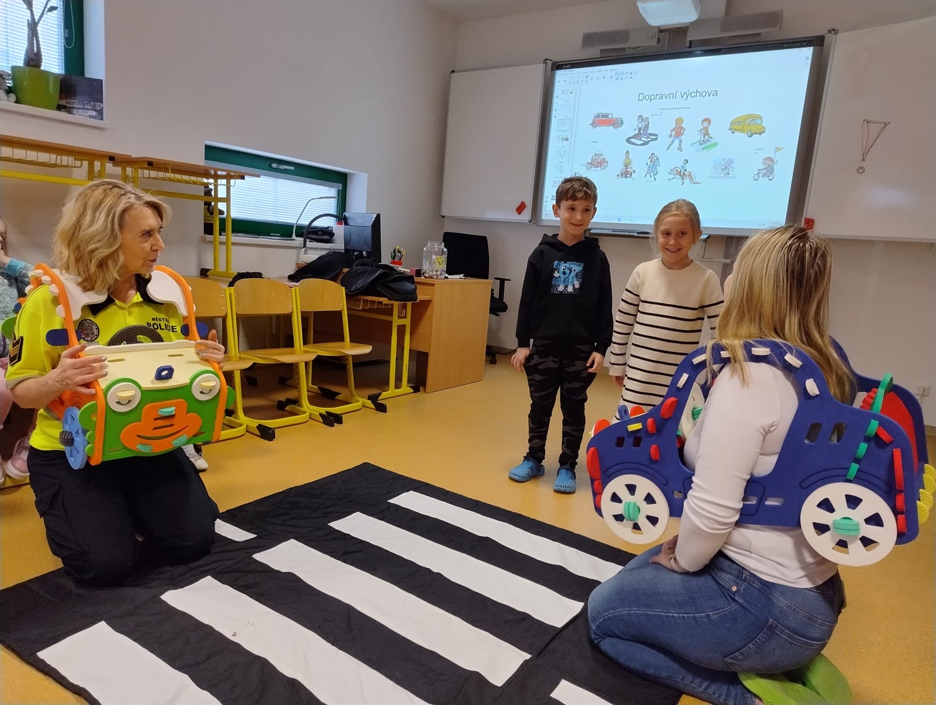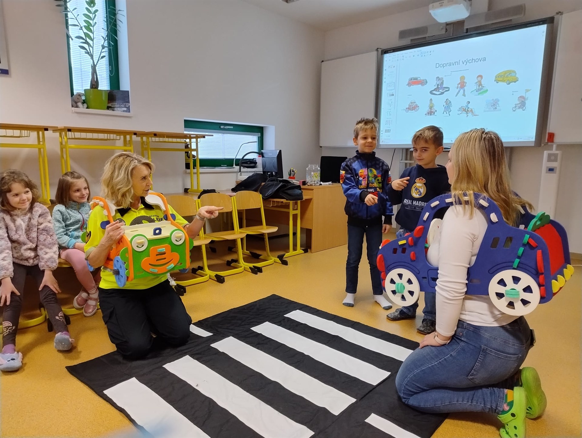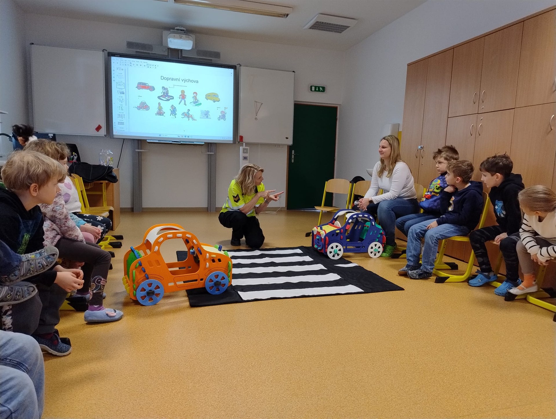 Cílem první návštěvy dopravního hřiště v Třebši byla naše bezpečnost v provozu. Učili jsme se správně přecházet silnici, zaměřili jsme se na dopravní značky, rozlišili rozdíl mezi chodcem a cyklistou. Povídali jsme si o neukázněných řidičích na silnici, a také o nebezpečných situacích. Nechybělo ani správné nasazení cyklistické helmy a připomenutí, že děti ji musí mít na hlavě vždy, když usedají na kolo. Dopoledne jsme si moc užili, protože celá výuka byla interaktivní, se spoustou pomůcek a vtipnou paní policistkou.