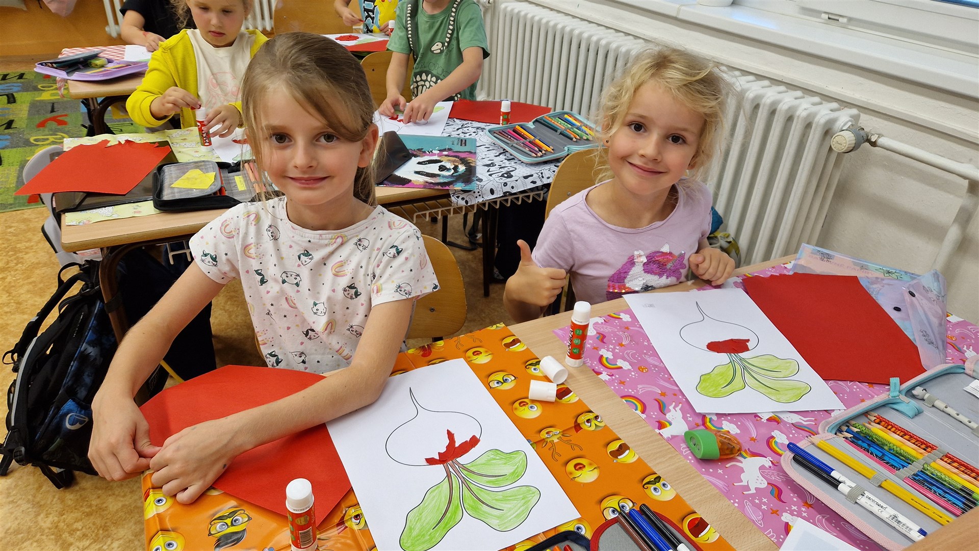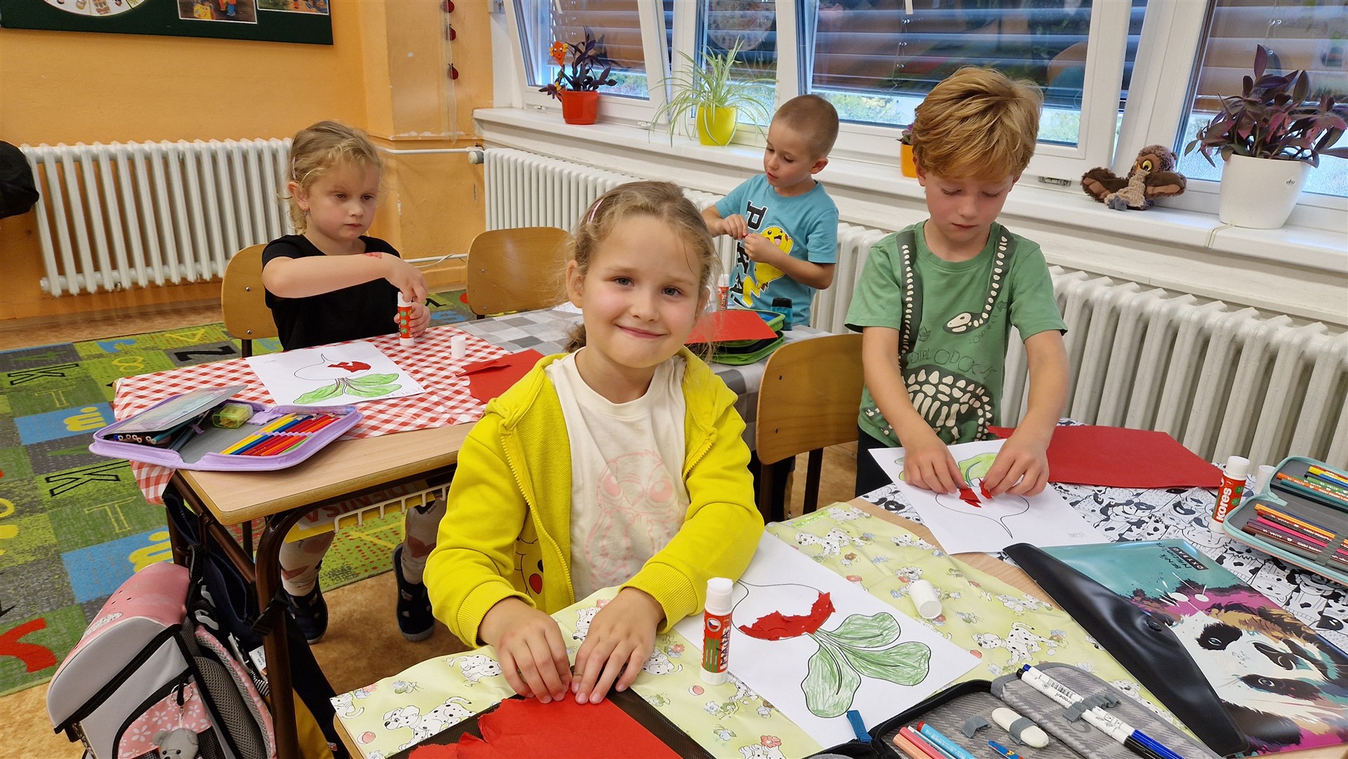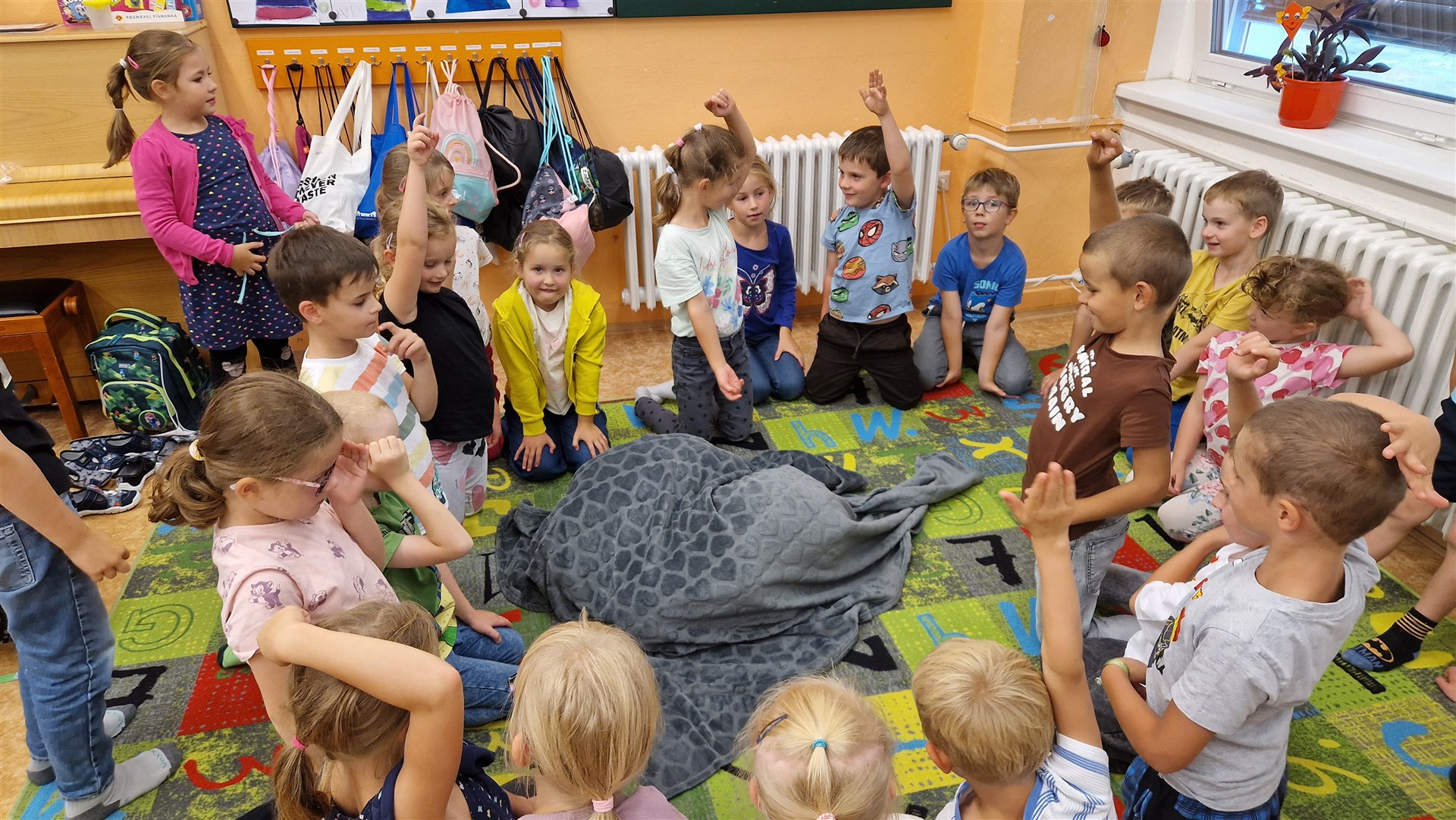 Máme za sebou první dva týdny školy a zasloužíme si velkou pochvalu! Počítáme, hrajeme si se slovy a obrázky, trénujeme prostorovou orientaci, uvolňovacími cviky připravujeme ruce na psaní a zbývá čas i na dramatizaci pohádky - třeba tu "O veliké řepě".