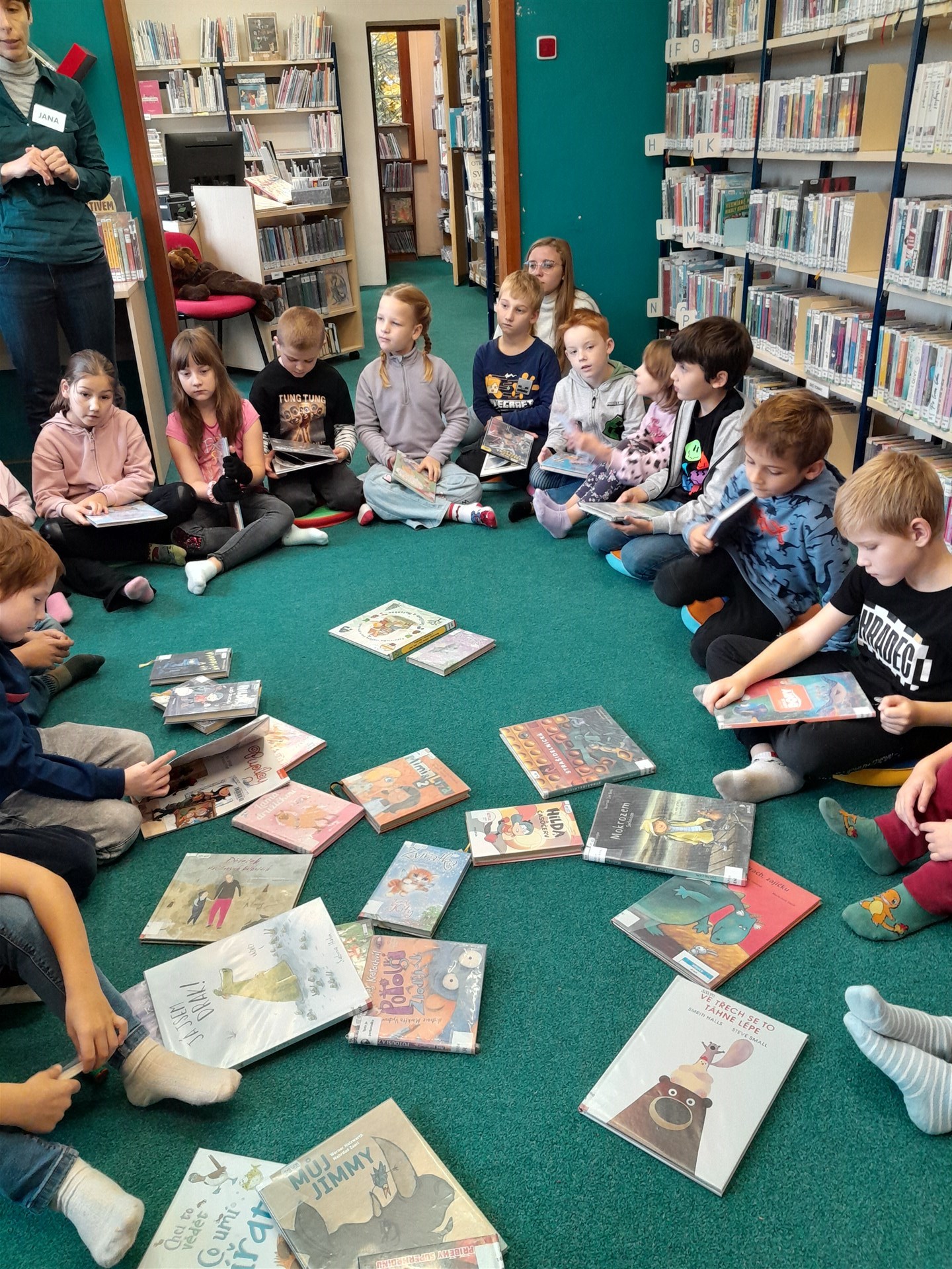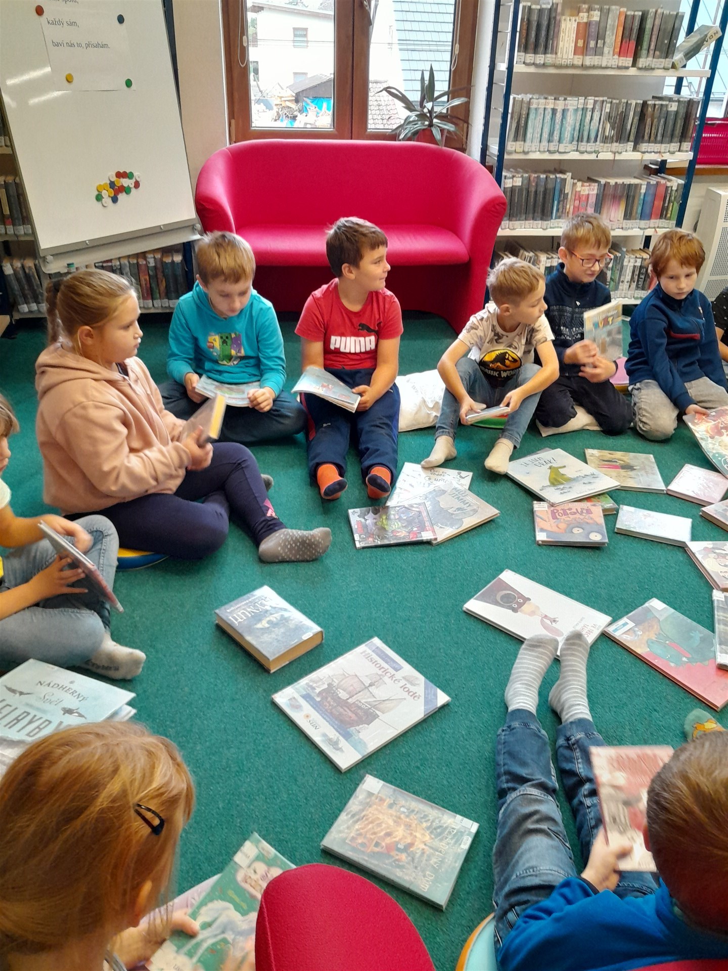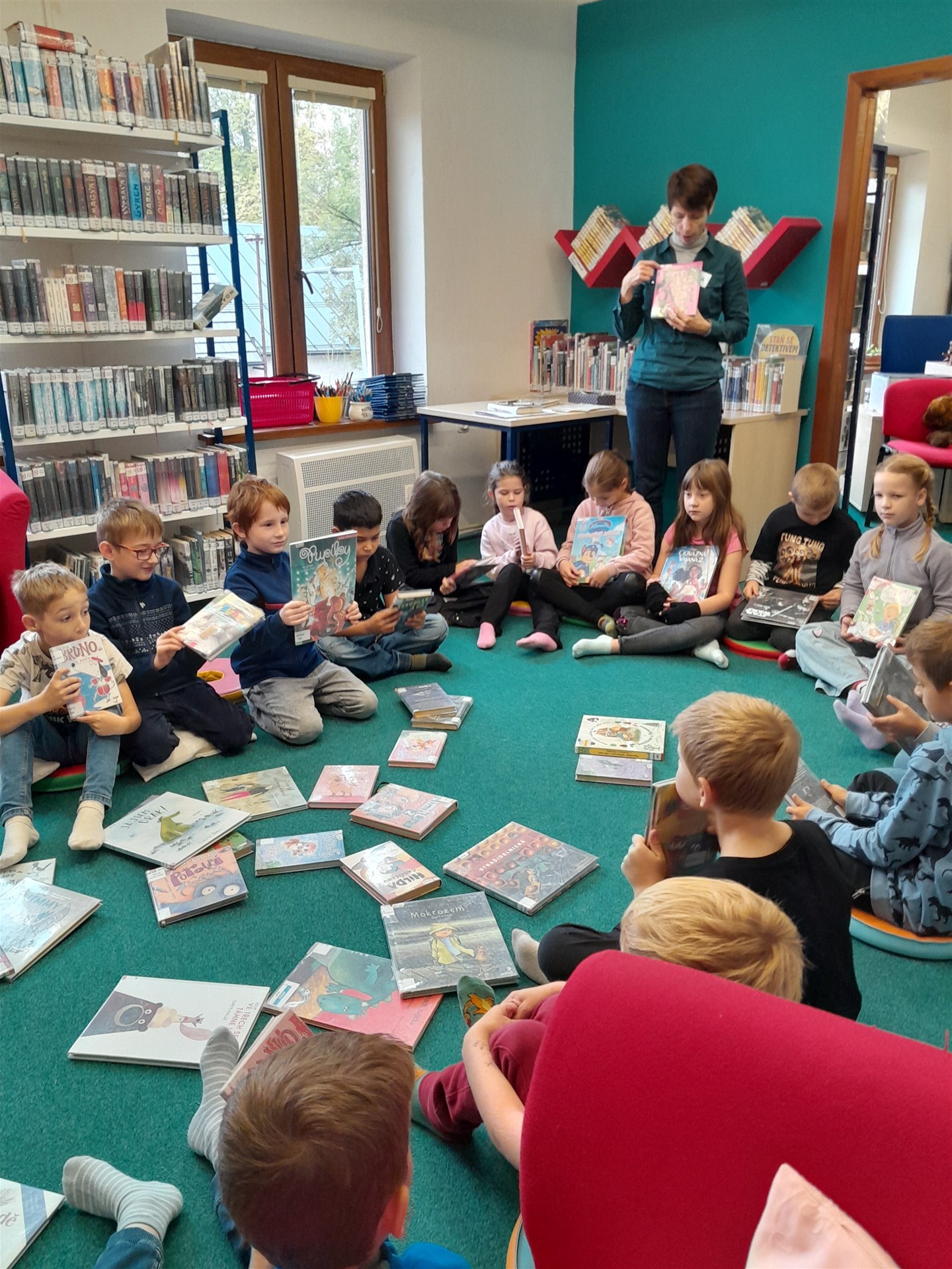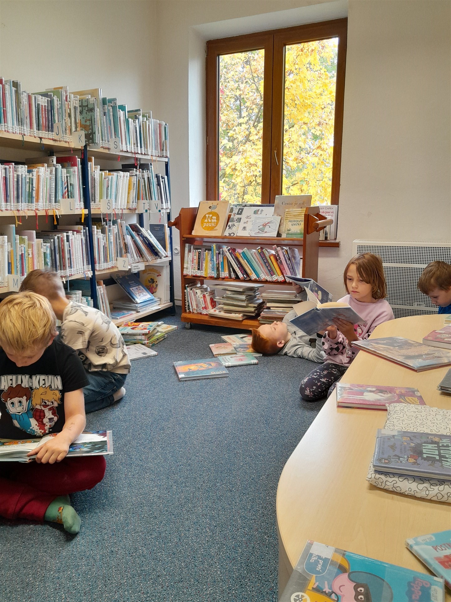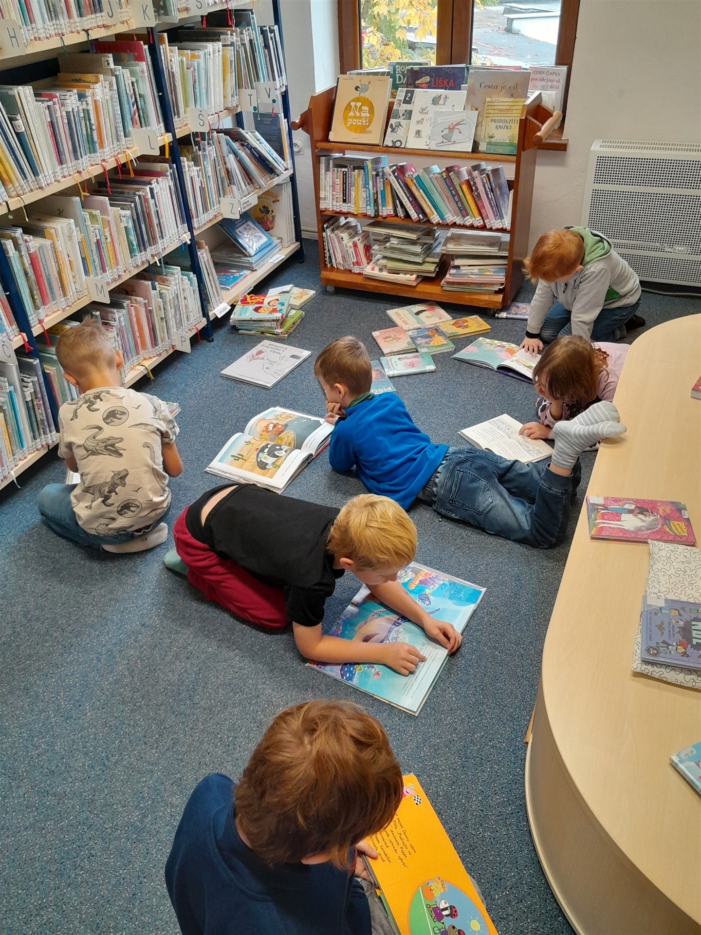 Ve čtvrtek 16.října jsme se vypravili do knihovny. Čas před setkáním s knížkami jsme si zkátili hraním na hřišti. Když si děti vyklepaly písek z bot, mohli jsme se vydat do světa písmenek, pohádek, ilustrací, fantastických příběhů. Paní knihovnice dětem připomněla základní pravidla půjčování knížek v knihovně a učila je práci při čtenářské dílně. Nakonec si ten, kdo byl vyzbrojen svou vlastní kartičkou čtenáře, půjčil knížky domů. Někdo se těší, že mu paní knihovnice průkazku vystaví, až do knihovny zavítá s rodiči, a všichni se těšíme na další dopoledne strávené mezi regály knih.