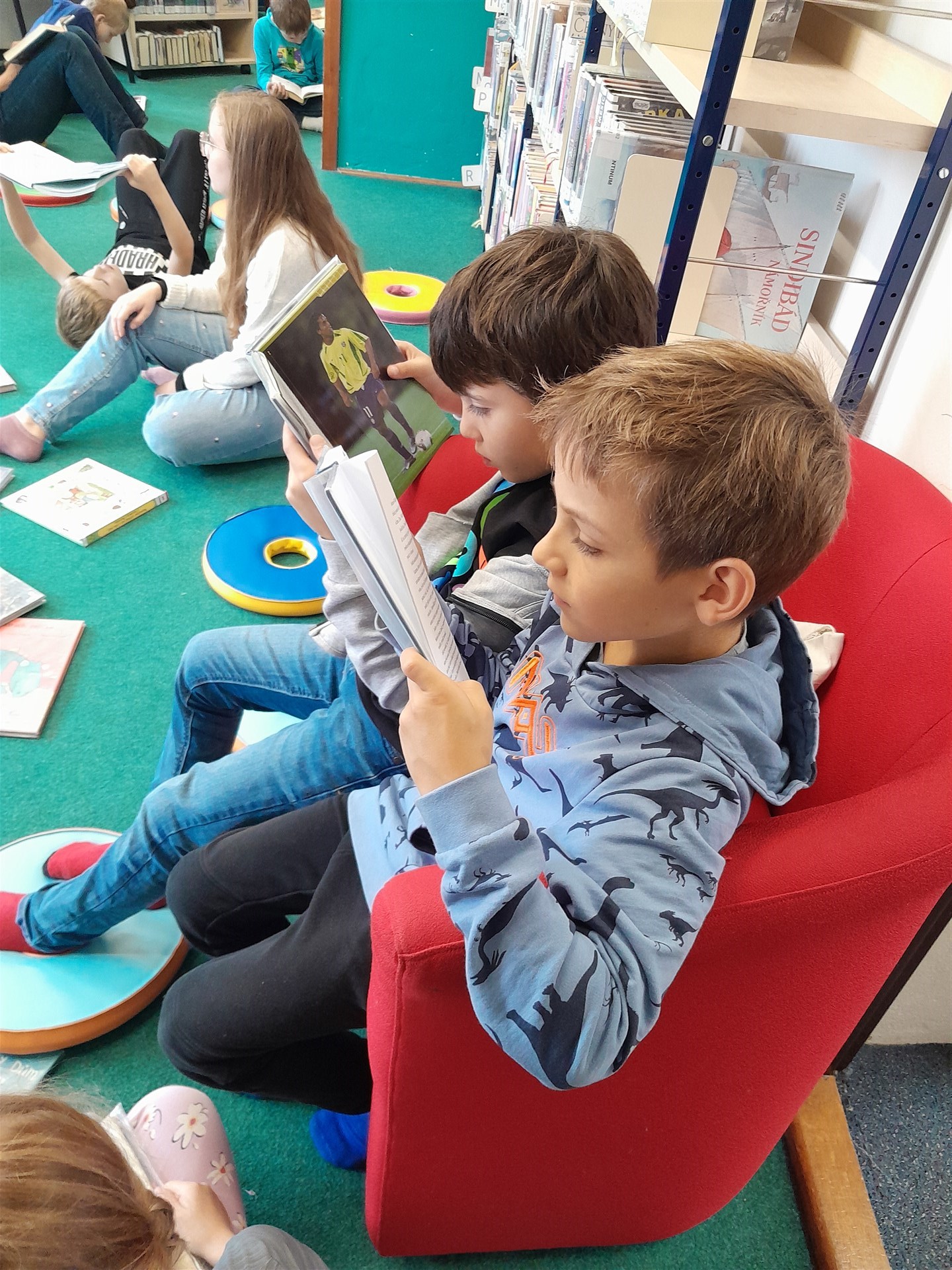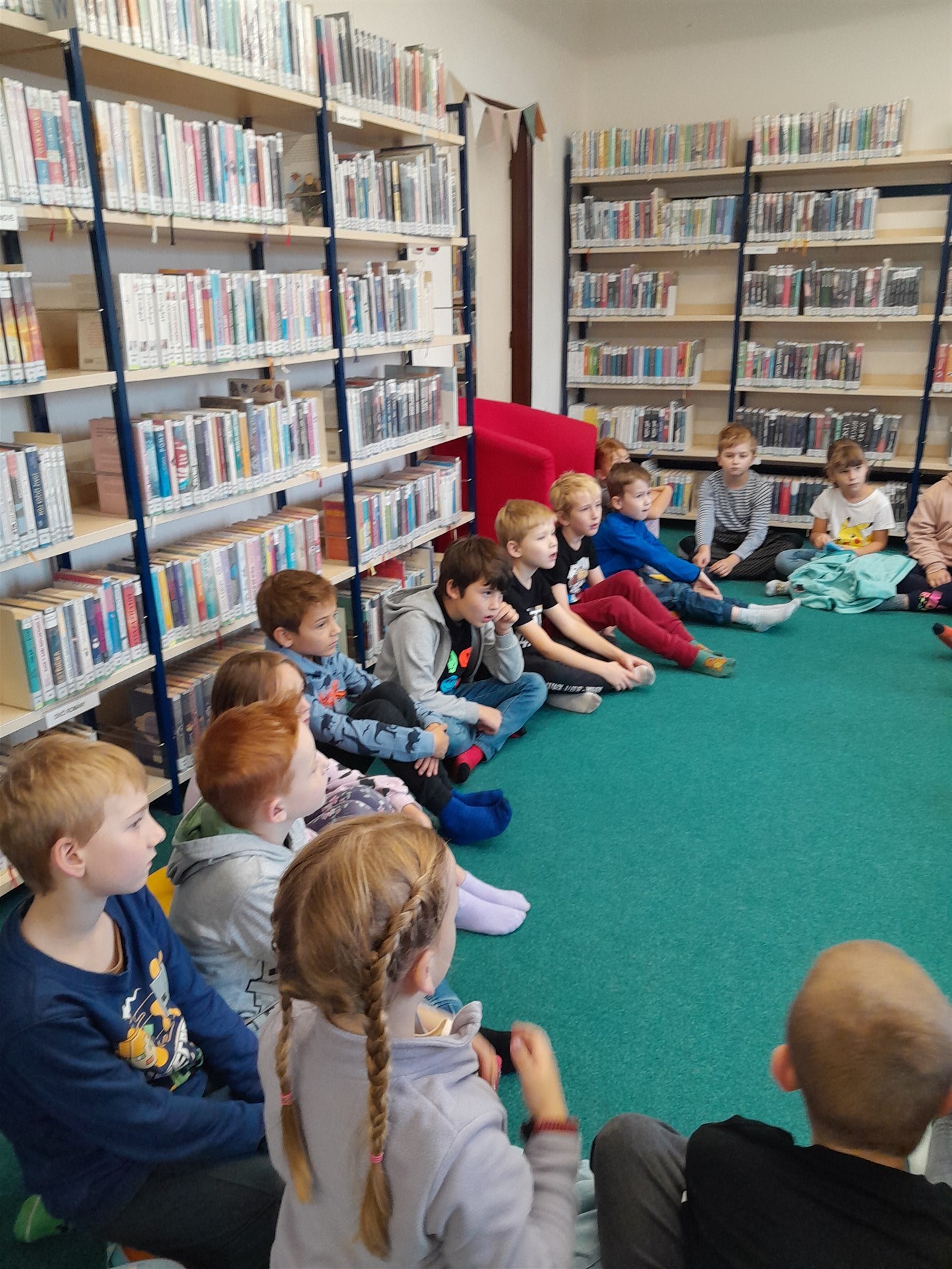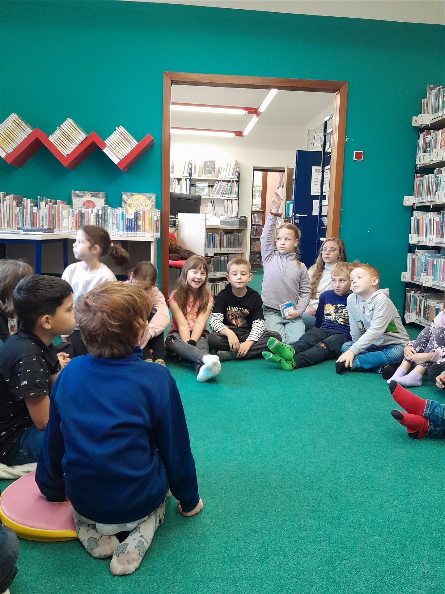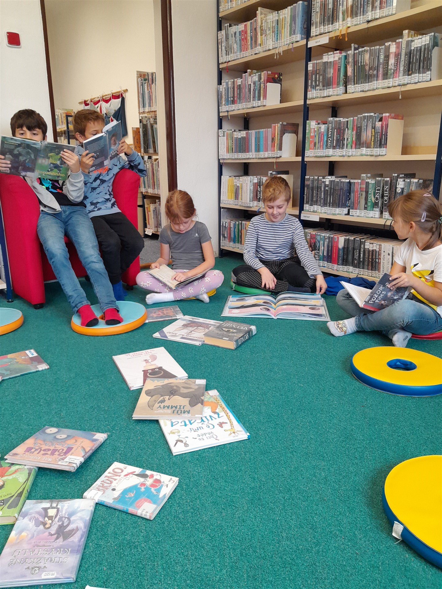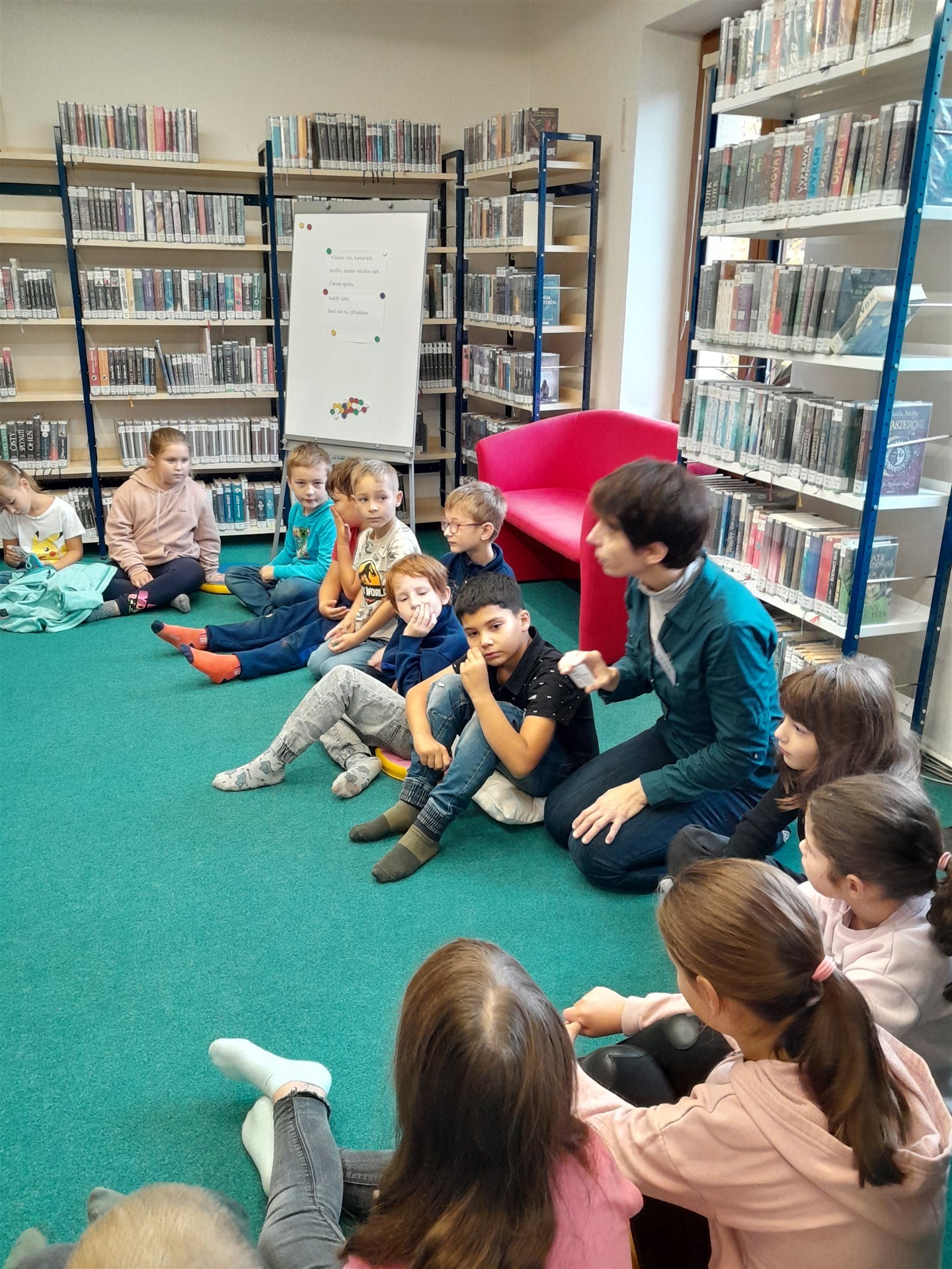 Ve čtvrtek 16.října jsme se vypravili do knihovny. Čas před setkáním s knížkami jsme si zkátili hraním na hřišti. Když si děti vyklepaly písek z bot, mohli jsme se vydat do světa písmenek, pohádek, ilustrací, fantastických příběhů. Paní knihovnice dětem připomněla základní pravidla půjčování knížek v knihovně a učila je práci při čtenářské dílně. Nakonec si ten, kdo byl vyzbrojen svou vlastní kartičkou čtenáře, půjčil knížky domů. Někdo se těší, že mu paní knihovnice průkazku vystaví, až do knihovny zavítá s rodiči, a všichni se těšíme na další dopoledne strávené mezi regály knih.