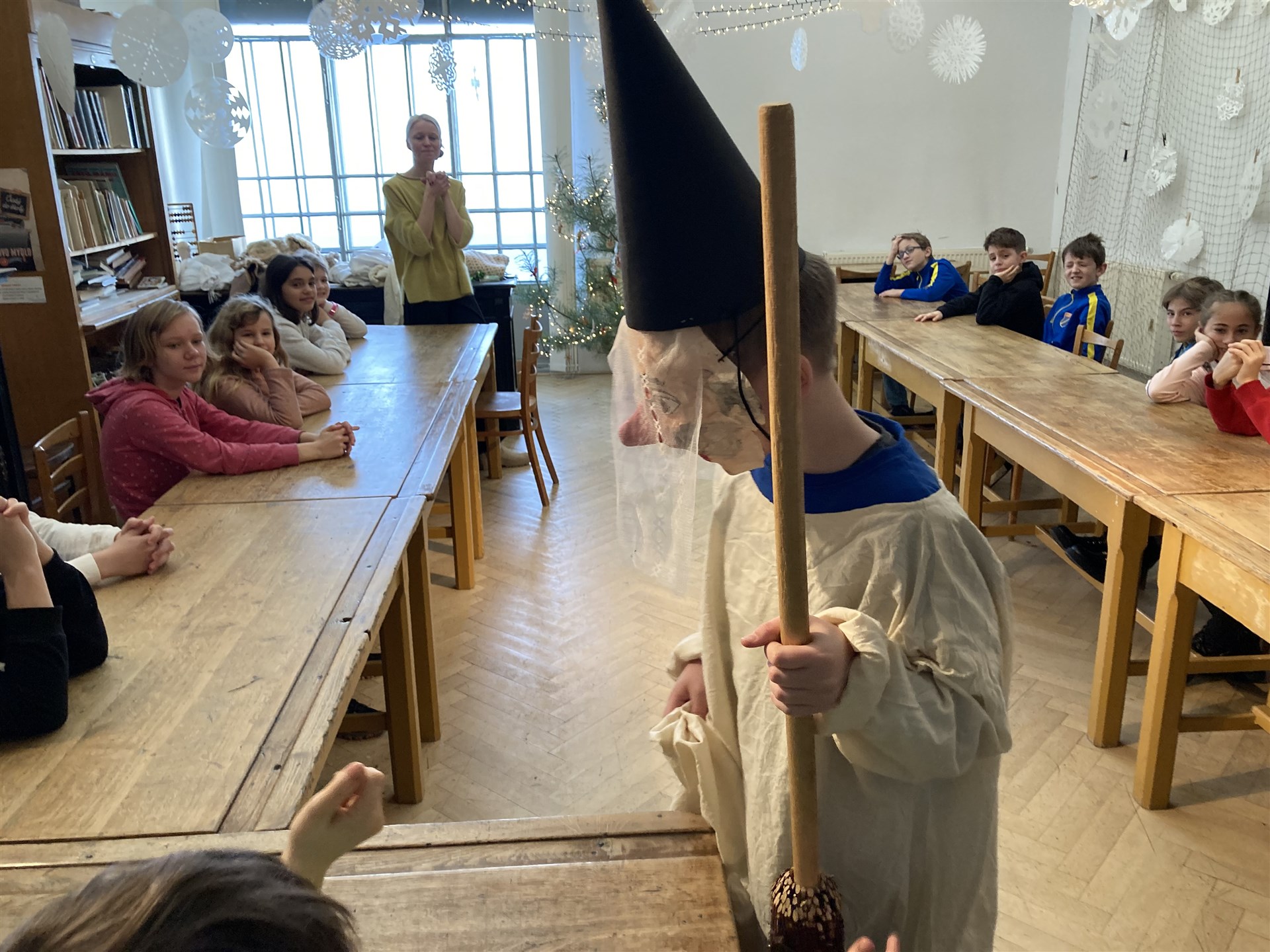 5. 12. 2024 navštívily děti z 5.B muzeum, byla to třetí a závěrečná letošní návštěva. Dověděly se, jak tento čas prožívali lidé dříve, jaké měly zvyky. Poznaly se se sv. Barborou, sv. Ambrožem, sv. Lucií, se Žberkem a s Perchtou. V muzejní historické školní třídě v nejvyšším patře se mohly převléknout a zahrát si na tyto postavy. Poté jsme z nás skládali živý betlém a hodně jsme si o něm povídali. Vystříhali jsme si sněhové vločky. Celá budova muzea je vánočně vyzdobena. Dýchla na nás příjemná sváteční atmosféra.