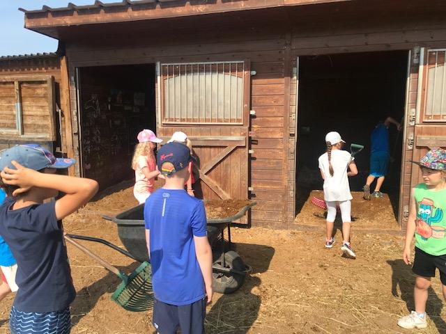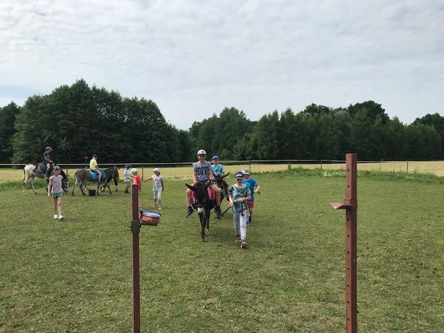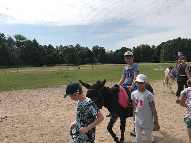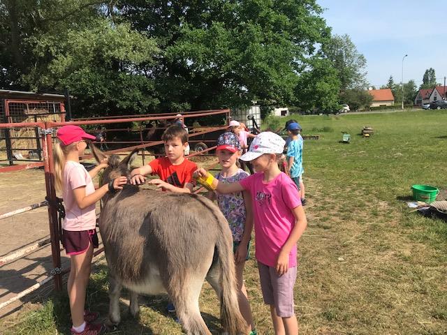 Dne 16.6. jsme měli domluvený pěší výlet na místo u slepých ramen Orlice, kde paní majitelka chová osli a koně. Ráno jsme se všichni sešli před školou a vydali se asi na hodinovou cestu přes louku směrem k výběhům. Cesta nám utekla celkem rychle, protože jsme ještě plnili úkoly zaměřené na znalosti 2. r. Paní majitelka nás přivítala a hned na úvod dětem přidělila práci - čištění a výzdobu stájí - čehož se děti zhostily s nadšením a během chvilky měly hotovo. Poté dostaly kartáče na čištění srsti a rozdělily se na 2 skupiny, z nichž jedna vyrazila na okruh ve výběhu. Zde se vystřídaly ve dvojicích ve vedení oslíka i v jízdě. Při zpáteční cestě jsme se ještě stihli vyfotit na balících sena a kolem 13 h se vrátili ke škole.
