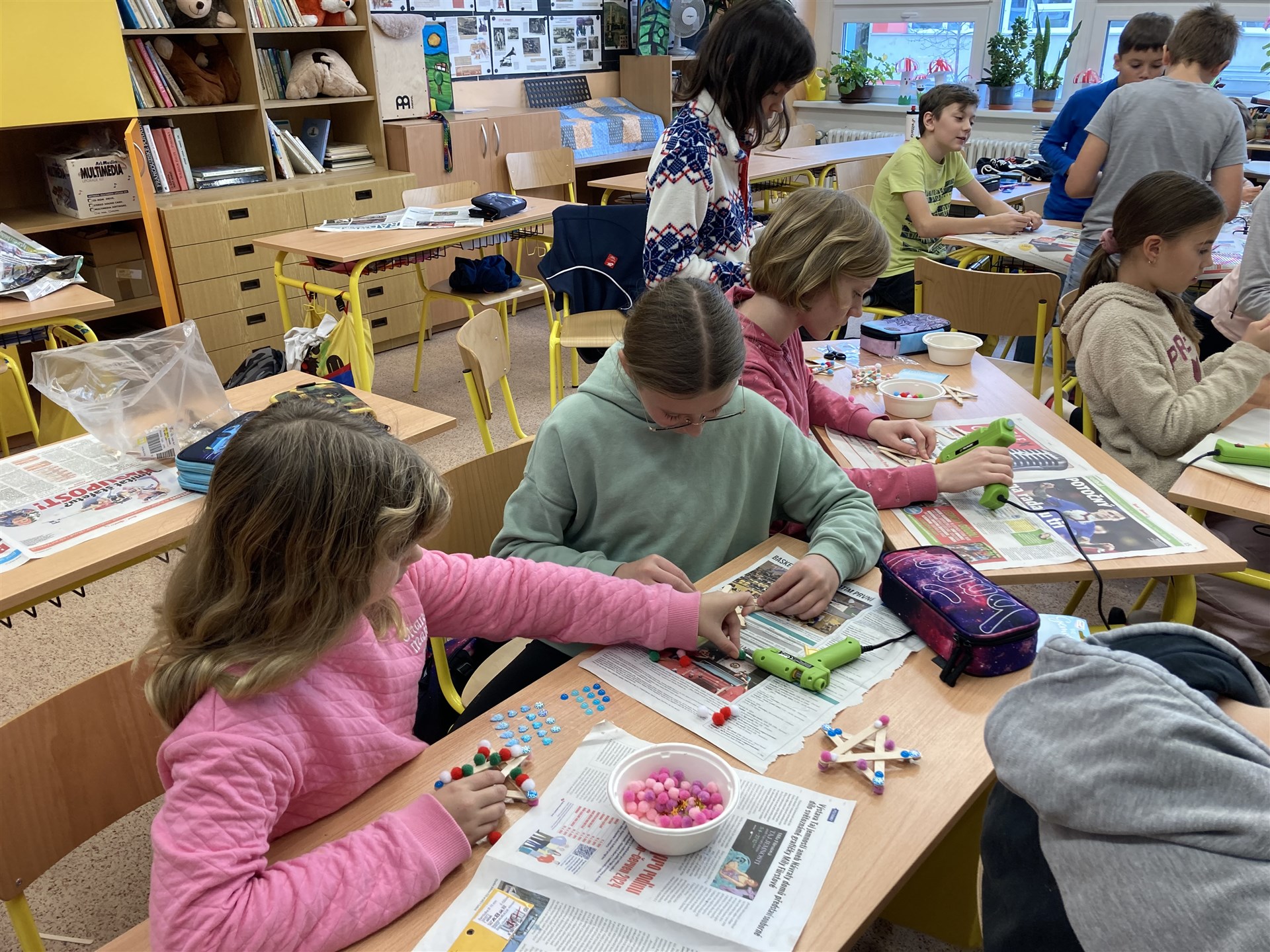 V 5. B probíhá pilná práce, v rámci Vv a Pč zhotovujeme vánoční ozdoby z dřevěných špachtliček, bambulek, korálků a drátků, z kolíčků. Budeme jimi zdobit jedličku na Velkém náměstí v rámci vánočních trhů. Jedličku budeme mít možnost v jarních měsících i zasadit. Mgr. Dariusová