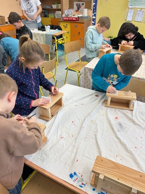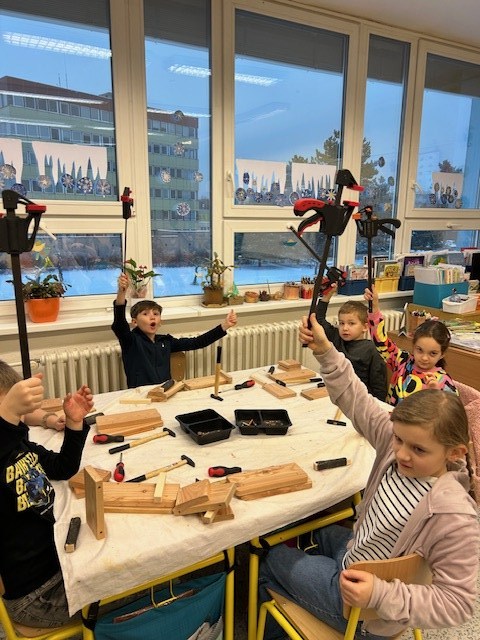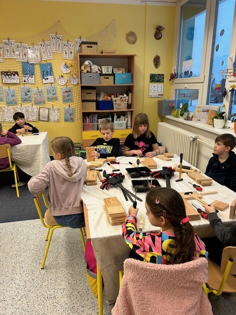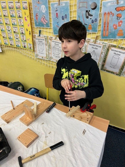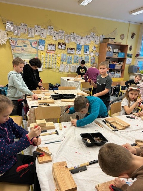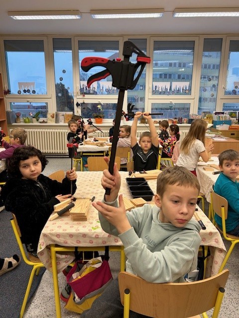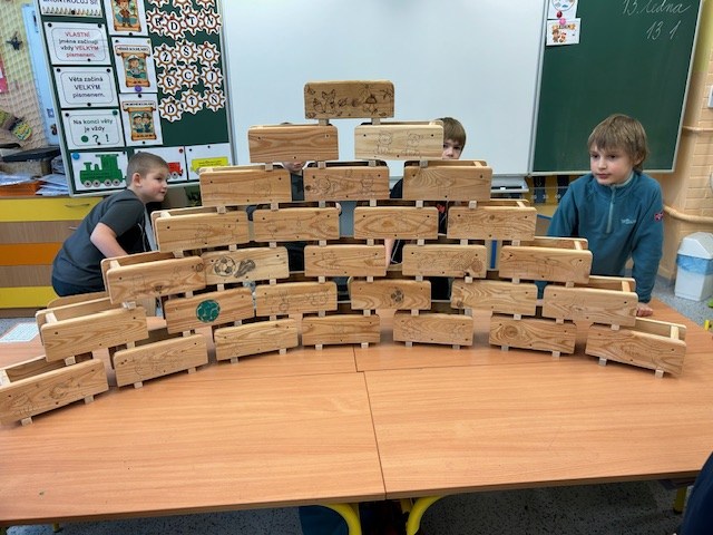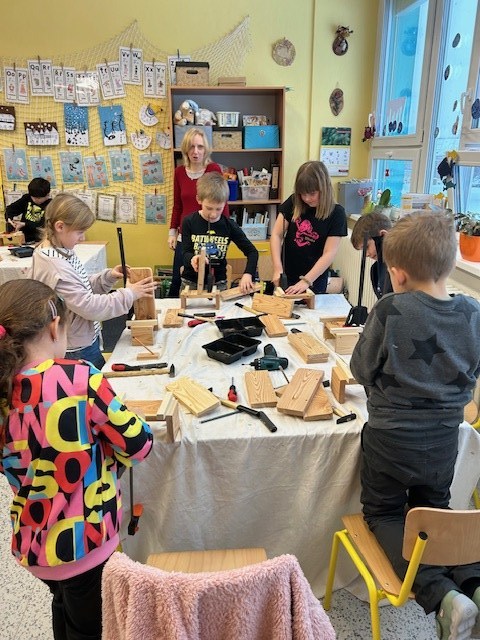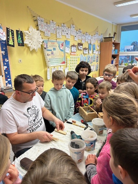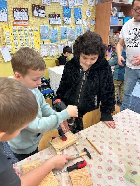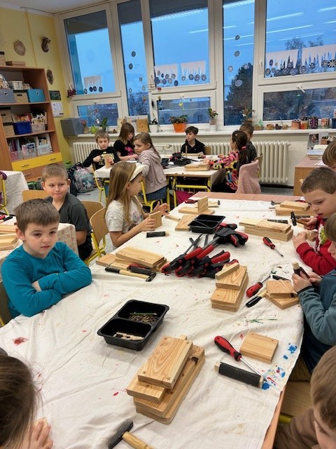 Dne 13.1. nás opět po roce navštívil pan truhlář, se kterým jsme vyráběli truhlík na květiny. Nejprve jsme připravené části dřeva obrousili, pak spojovali vruty, šroubovali, přibíjeli kladívkem a cca po 2 hodinách byl truhlík hotov. Nakonec si ho děti ozdobily podle šablon, někteří si stihli i vybarvit a nakonec jsme si s panem truhlářem za doprovodu kytary a harmoniky zazpívali písničky z pohádek a trochu si zasoutěžili (o dřevěné stojánky na tužky). Práce s panem truhlářem se dětem velmi líbila a příští rok se budeme těšit na další výrobek...