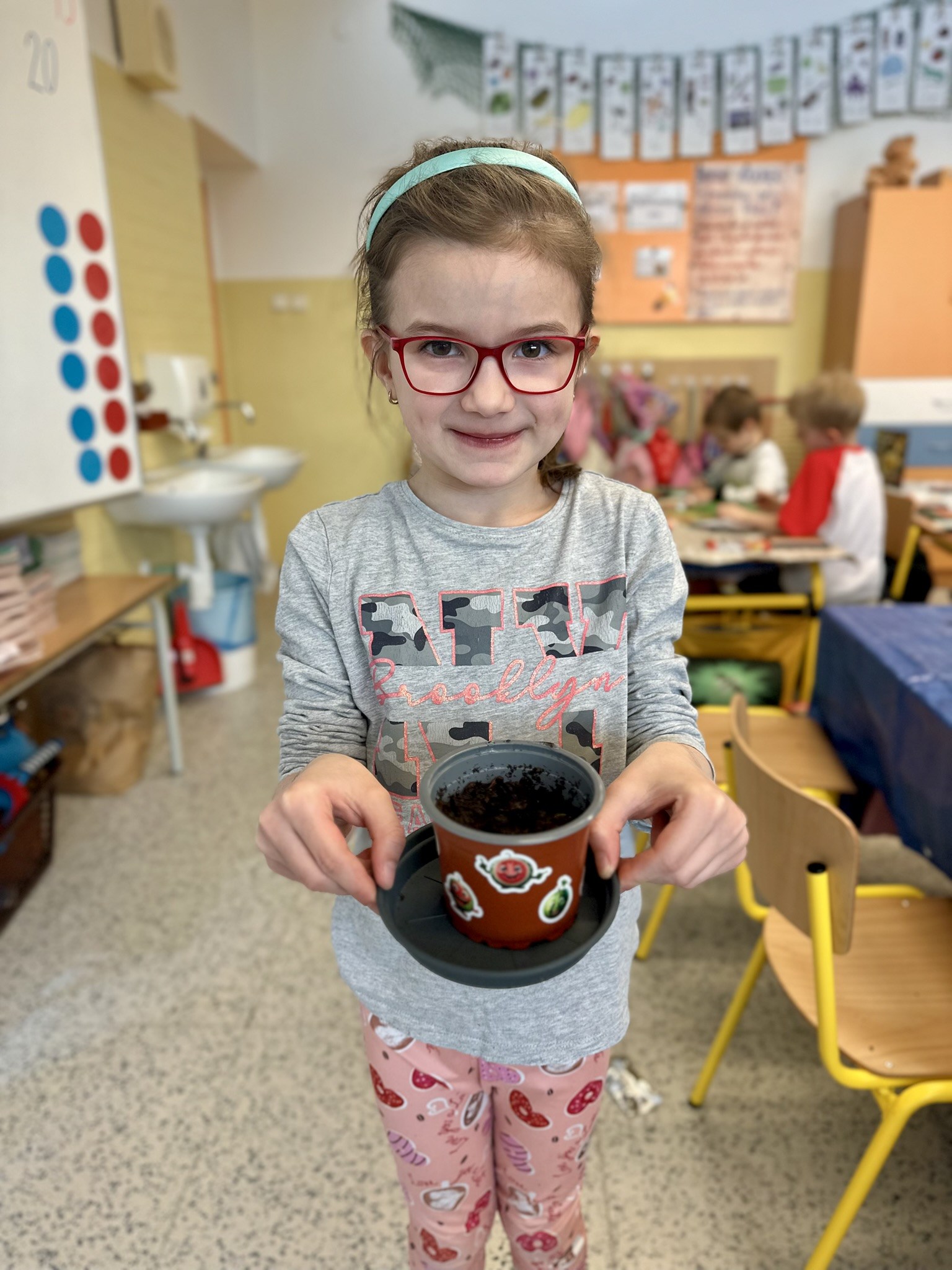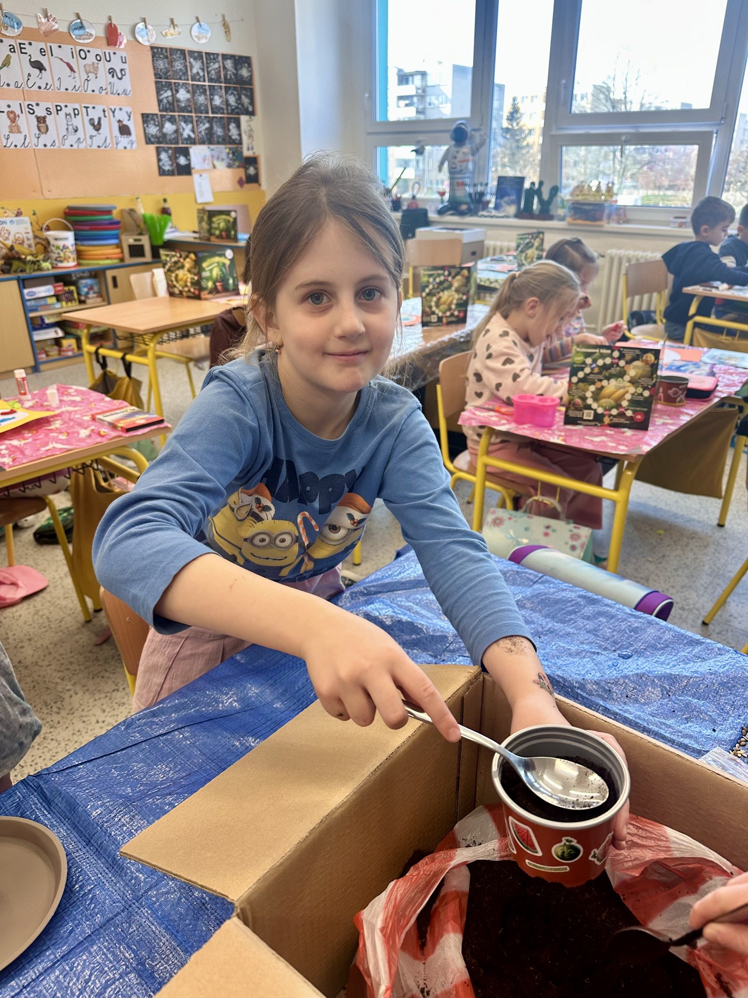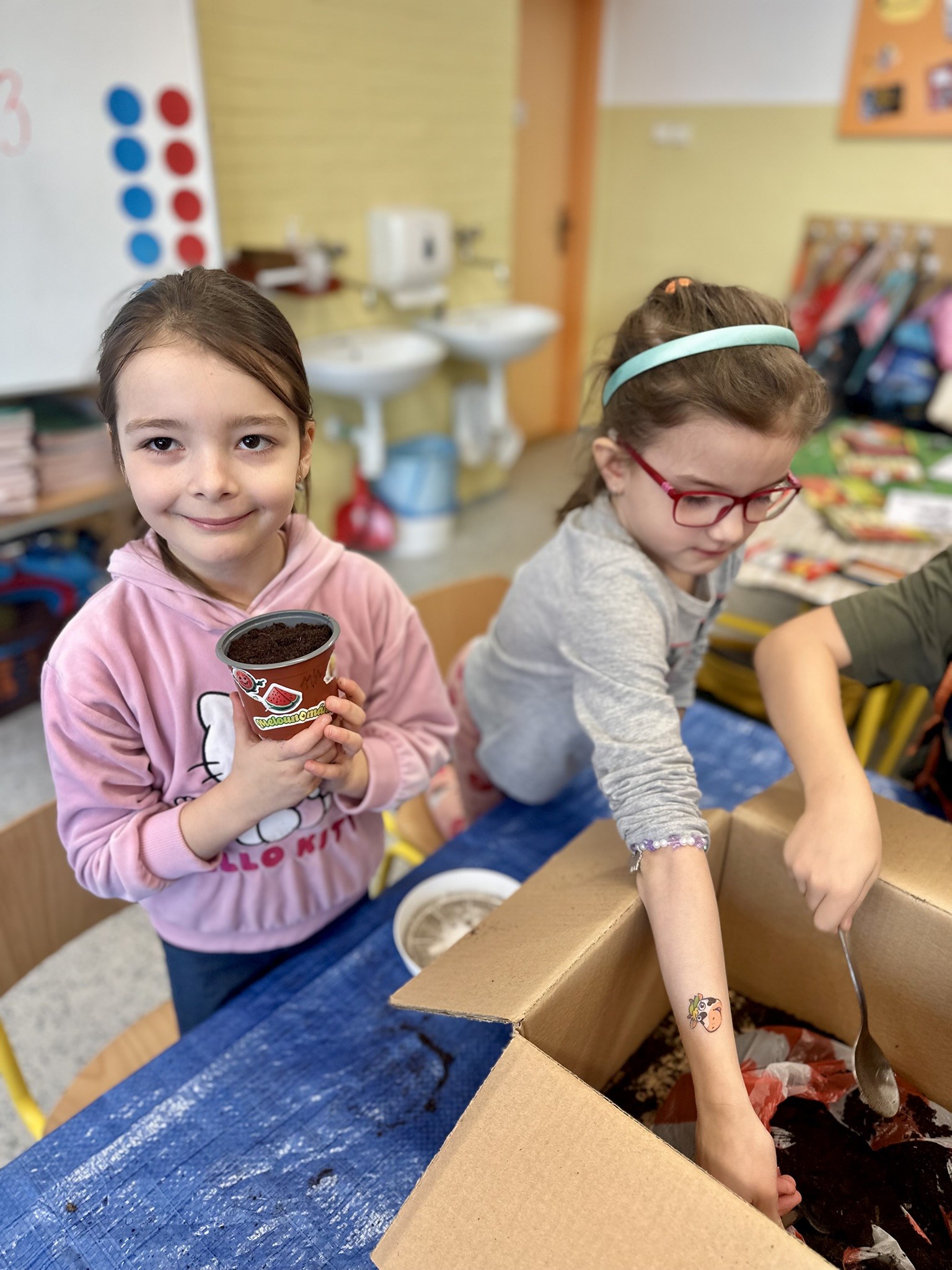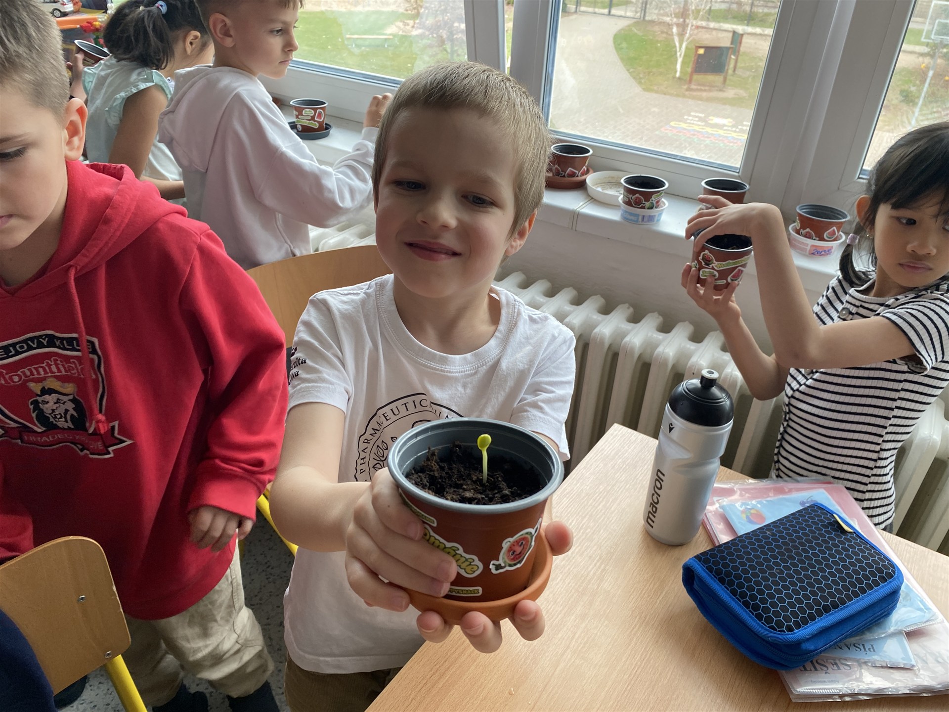 V březnu jsme se v pracovních činnostech věnovali zahradničení. V rámci projektu Ovoce a zelenina do škol jsme získali do školy semínka melounů. Ta jsme si zaseli a během celého měsíce března se o ně starali. Před Velikonocemi se už většině dětí začala rostlinka klubat z hlíny a my tak můžeme pozorovat, jak se semínko mění v rostlinu.