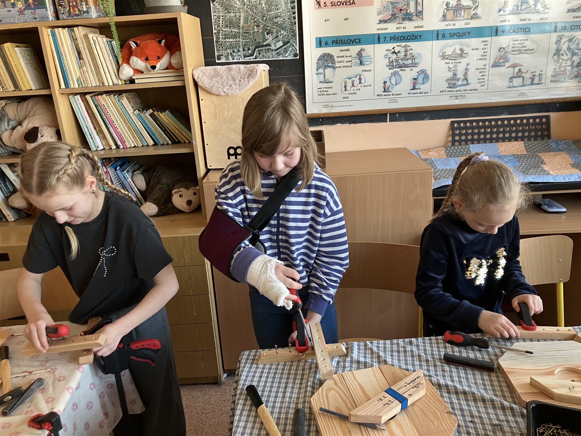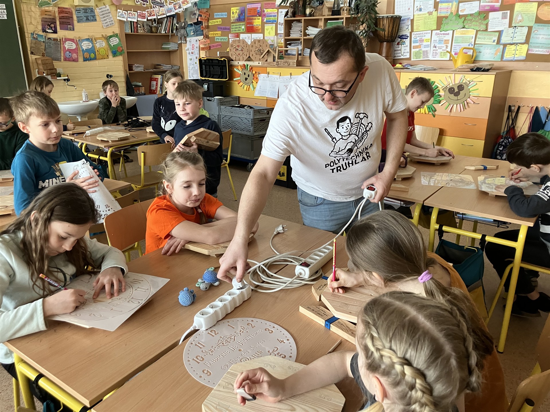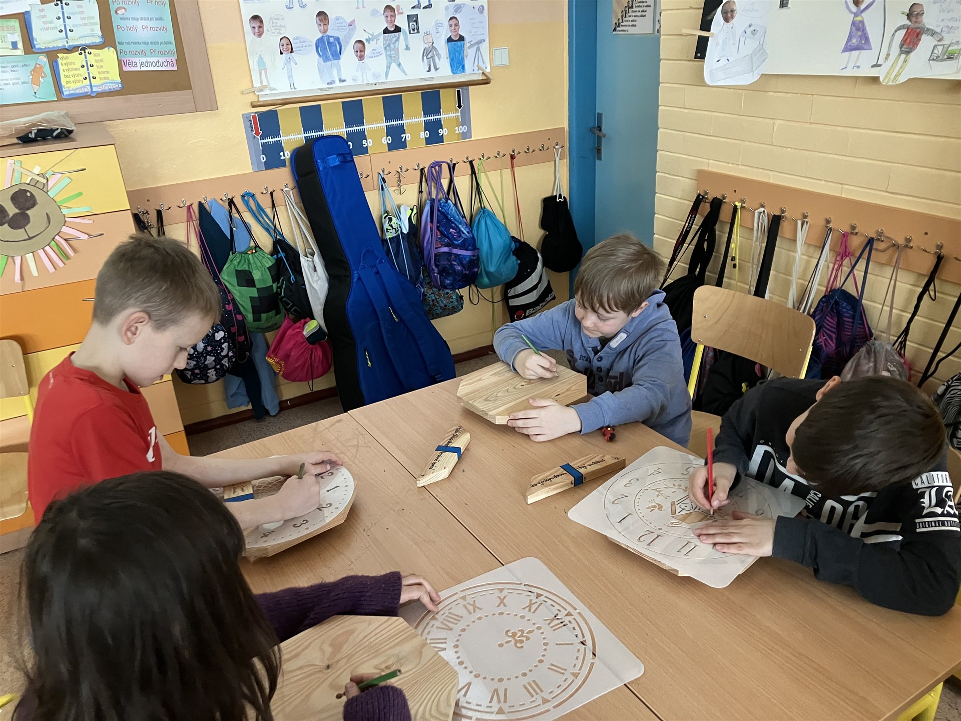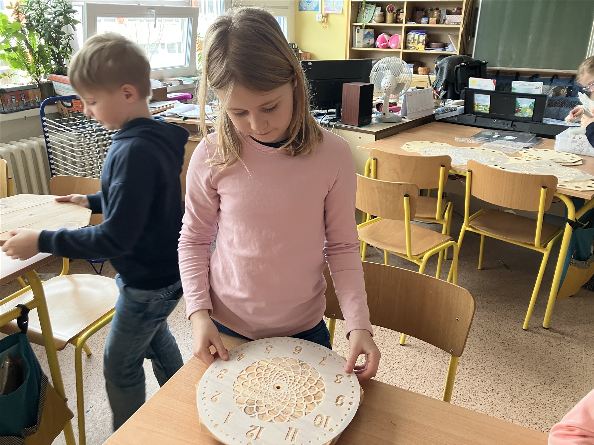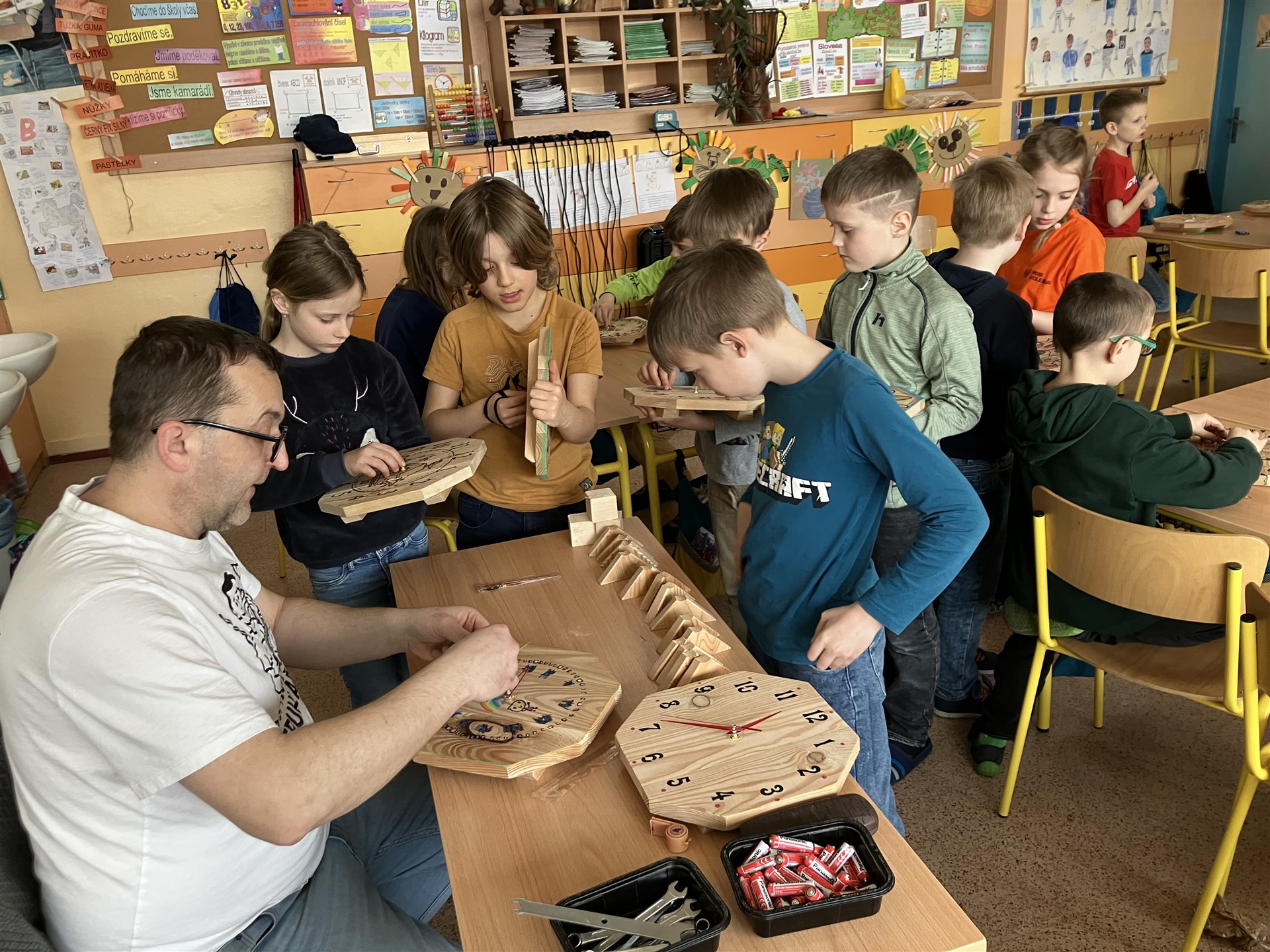Ve středu 1. 4. 2026 přijel za dětmi ze 3. C pan truhlář Petr Kaněra, přivezl s sebou truhlářské nářadí a připravené jednotlivé díly z modřínového dřeva na výrobu hodin. Pod jeho vedením si žáci díly spojili, nazdobili, vložili si hodinový strojek i s baterkou, připevnili si hodinové ručičky. Děti se k dílu stavěly velmi pozorně, zodpovědně i šikovně, všechny si přály, aby se jim dílo povedlo a aby se jejich hodiny líbily, protože se těšily, až je doma zavěsí. Práce se dřevem se nám všem líbila a mnoho nás naučila. Mgr. Kamila Dariusová