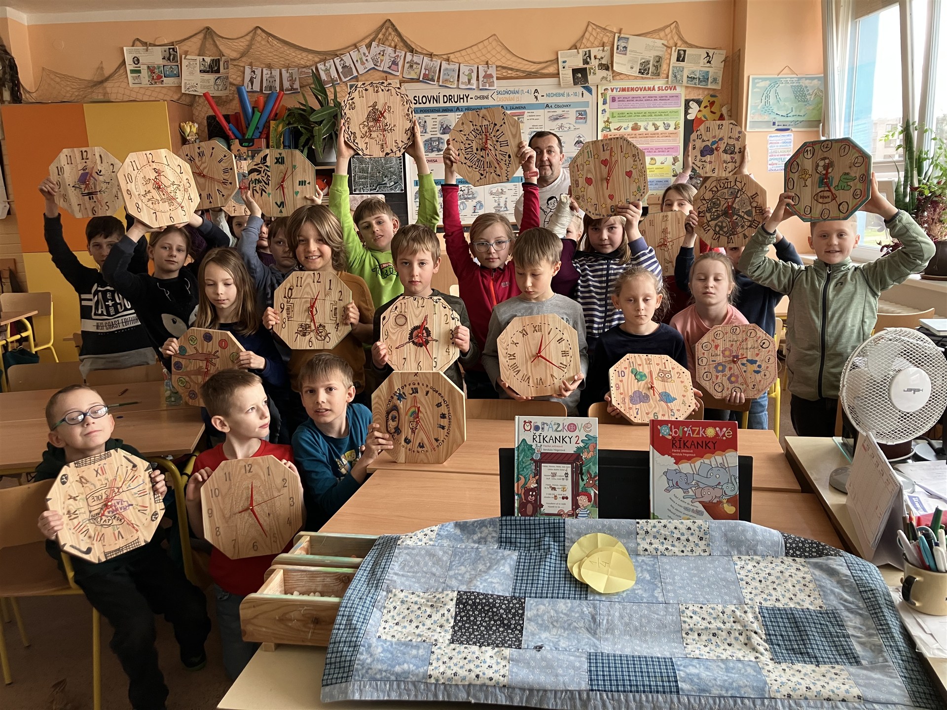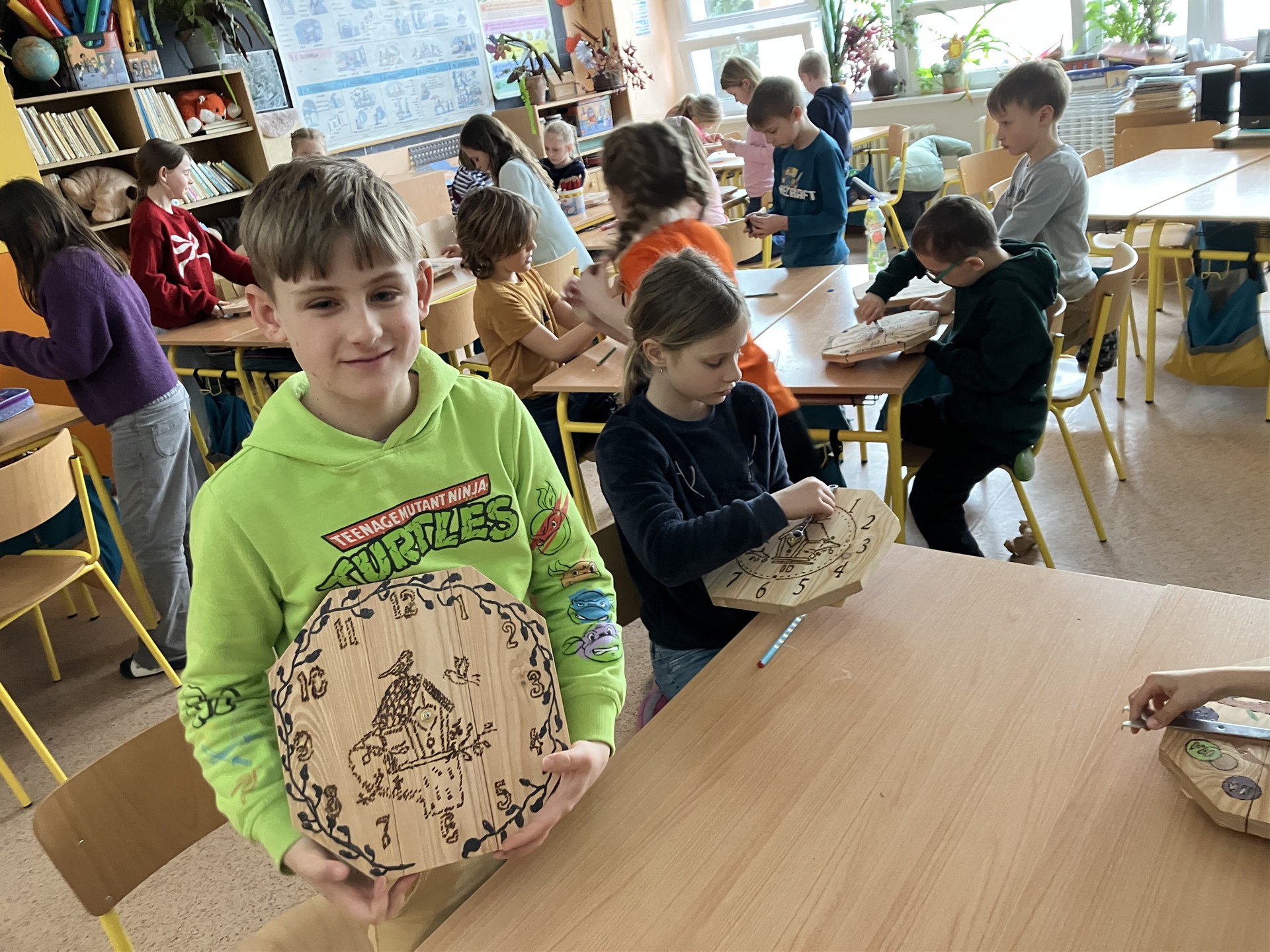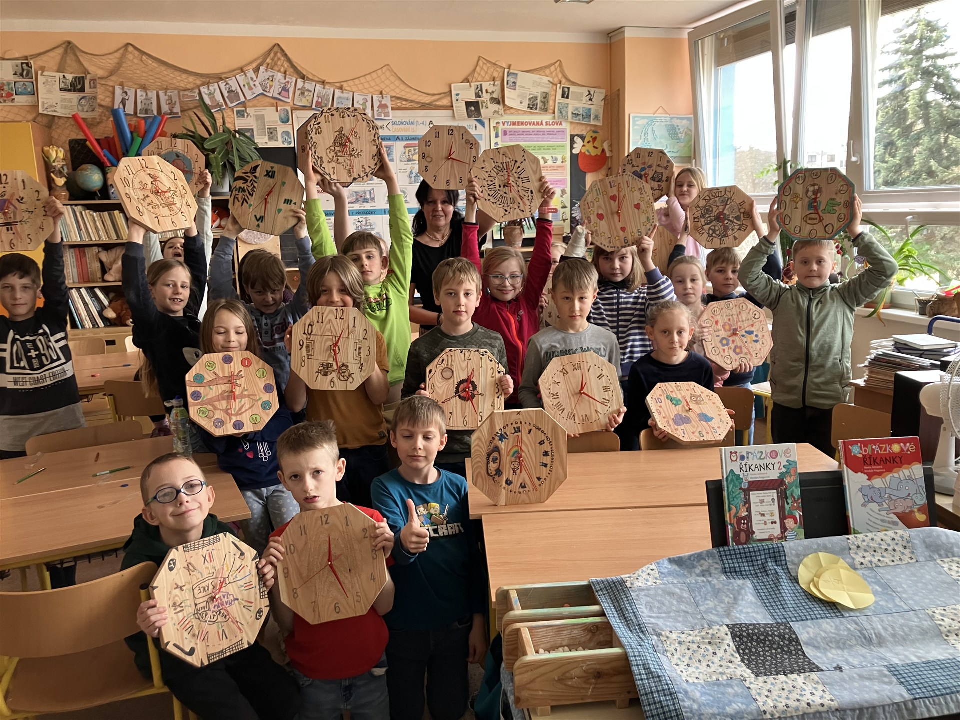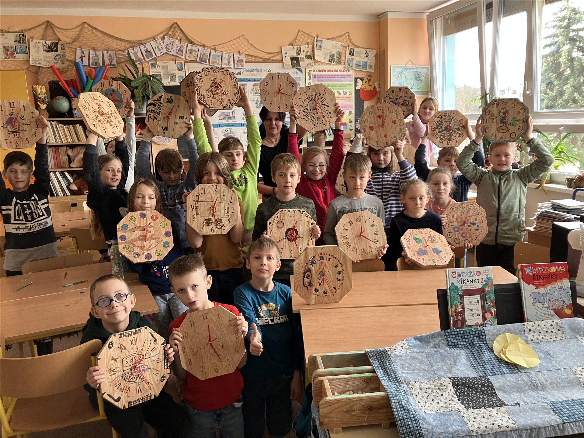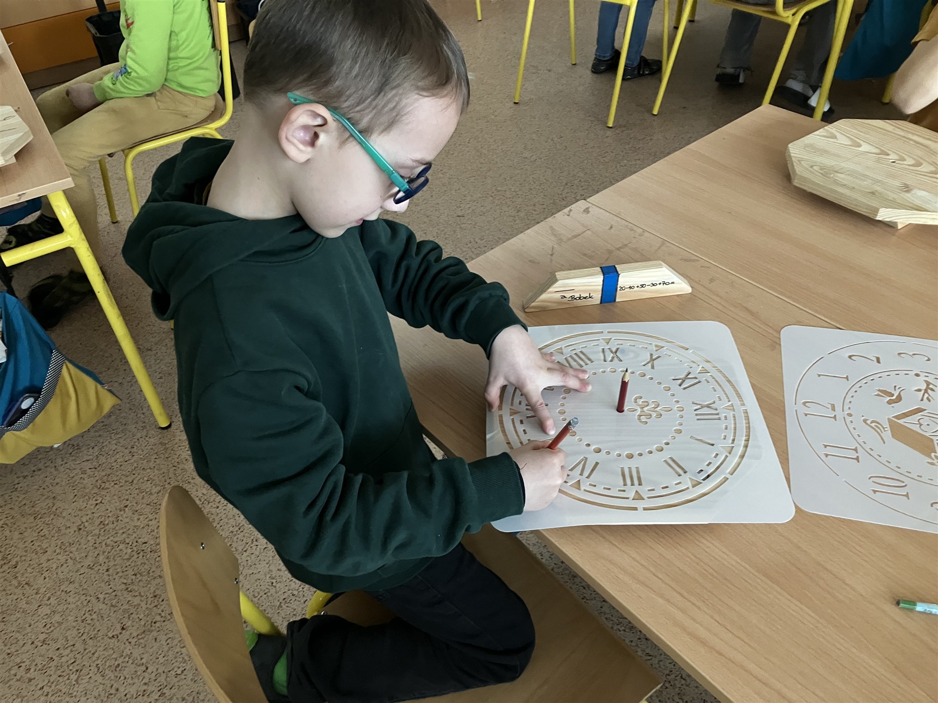 Ve středu 1. 4. 2026 přijel za dětmi ze 3. C pan truhlář Petr Kaněra, přivezl s sebou truhlářské nářadí a připravené jednotlivé díly z modřínového dřeva na výrobu hodin. Pod jeho vedením si žáci díly spojili, nazdobili, vložili si hodinový strojek i s baterkou, připevnili si hodinové ručičky. Děti se k dílu stavěly velmi pozorně, zodpovědně i šikovně, všechny si přály, aby se jim dílo povedlo a aby se jejich hodiny líbily, protože se těšily, až je doma zavěsí. Práce se dřevem se nám všem líbila a mnoho nás naučila. Mgr. Kamila Dariusová