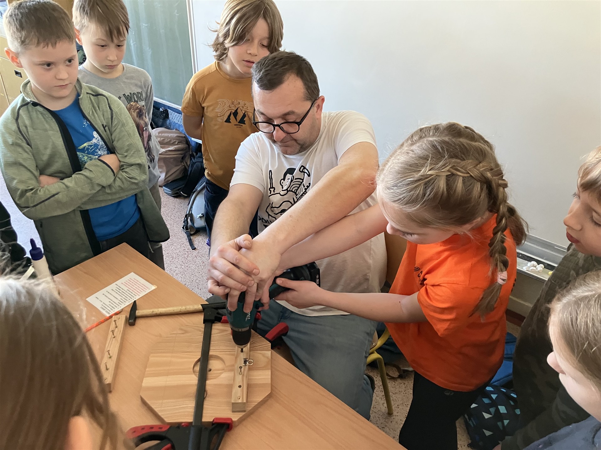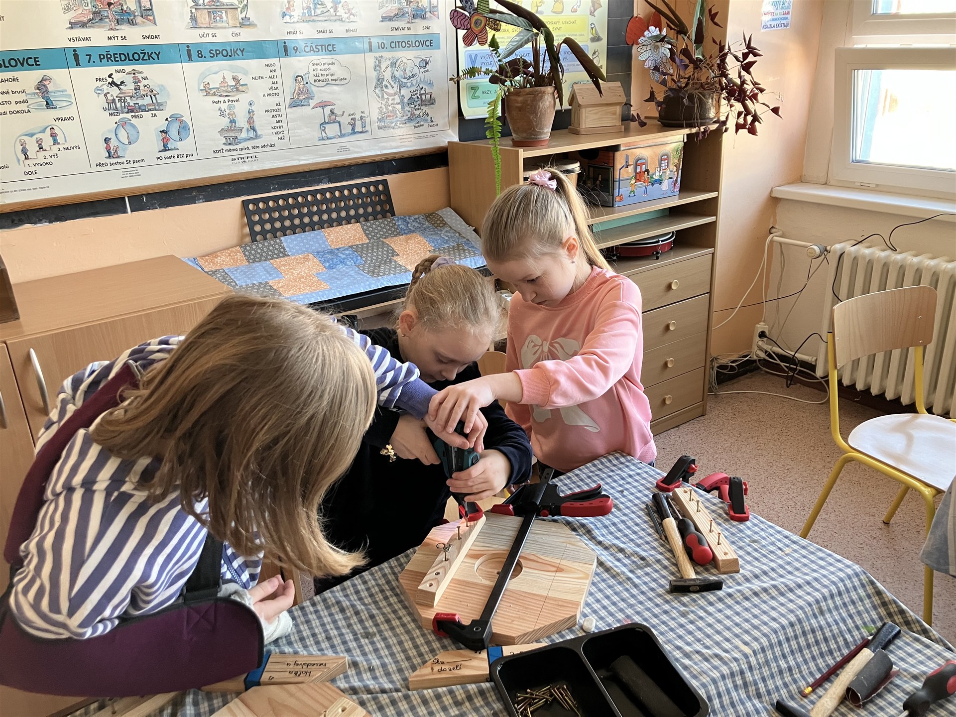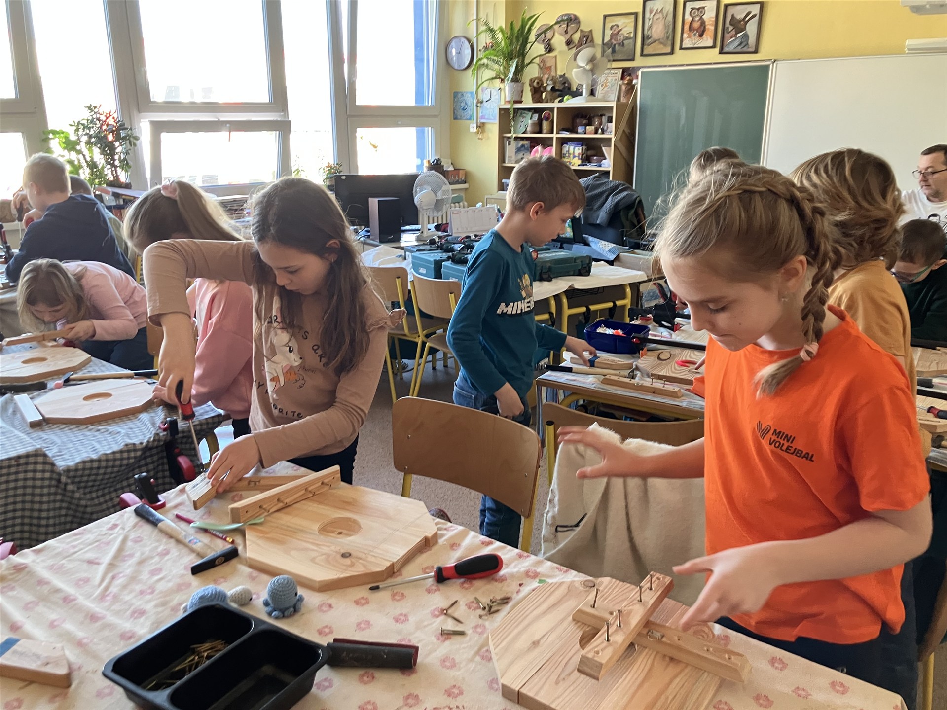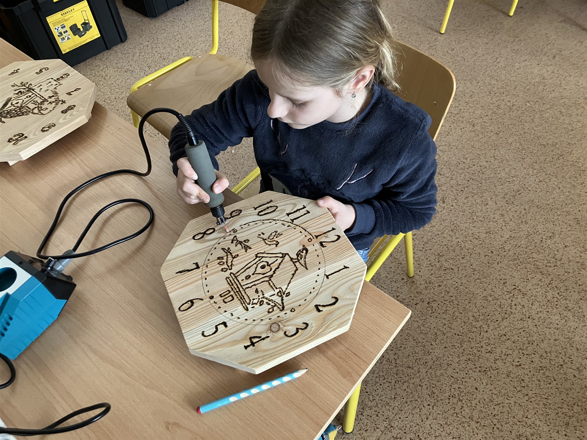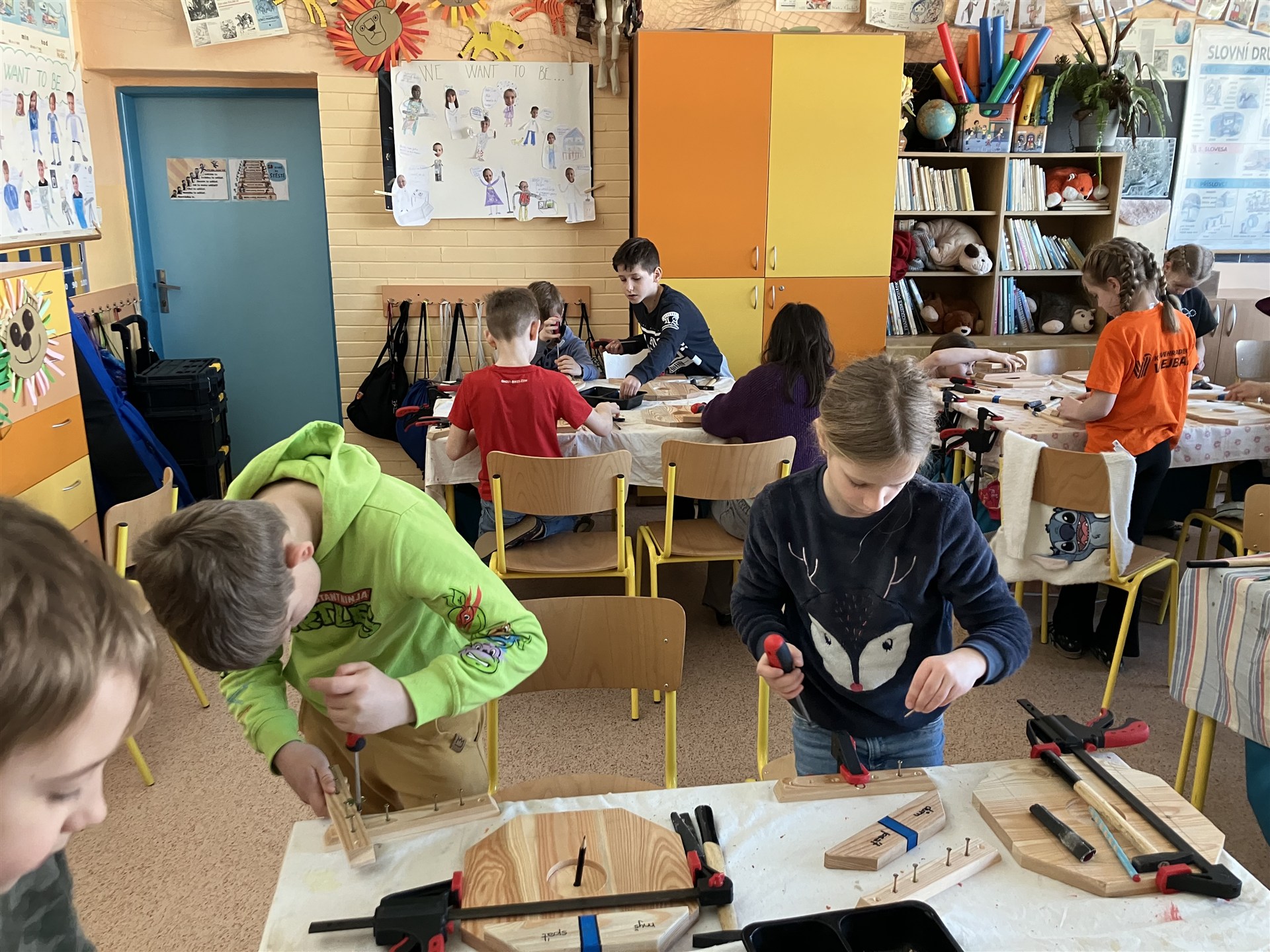 Ve středu 1. 4. 2026 přijel za dětmi ze 3. C pan truhlář Petr Kaněra, přivezl s sebou truhlářské nářadí a připravené jednotlivé díly z modřínového dřeva na výrobu hodin. Pod jeho vedením si žáci díly spojili, nazdobili, vložili si hodinový strojek i s baterkou, připevnili si hodinové ručičky. Děti se k dílu stavěly velmi pozorně, zodpovědně i šikovně, všechny si přály, aby se jim dílo povedlo a aby se jejich hodiny líbily, protože se těšily, až je doma zavěsí. Práce se dřevem se nám všem líbila a mnoho nás naučila. Mgr. Kamila Dariusová