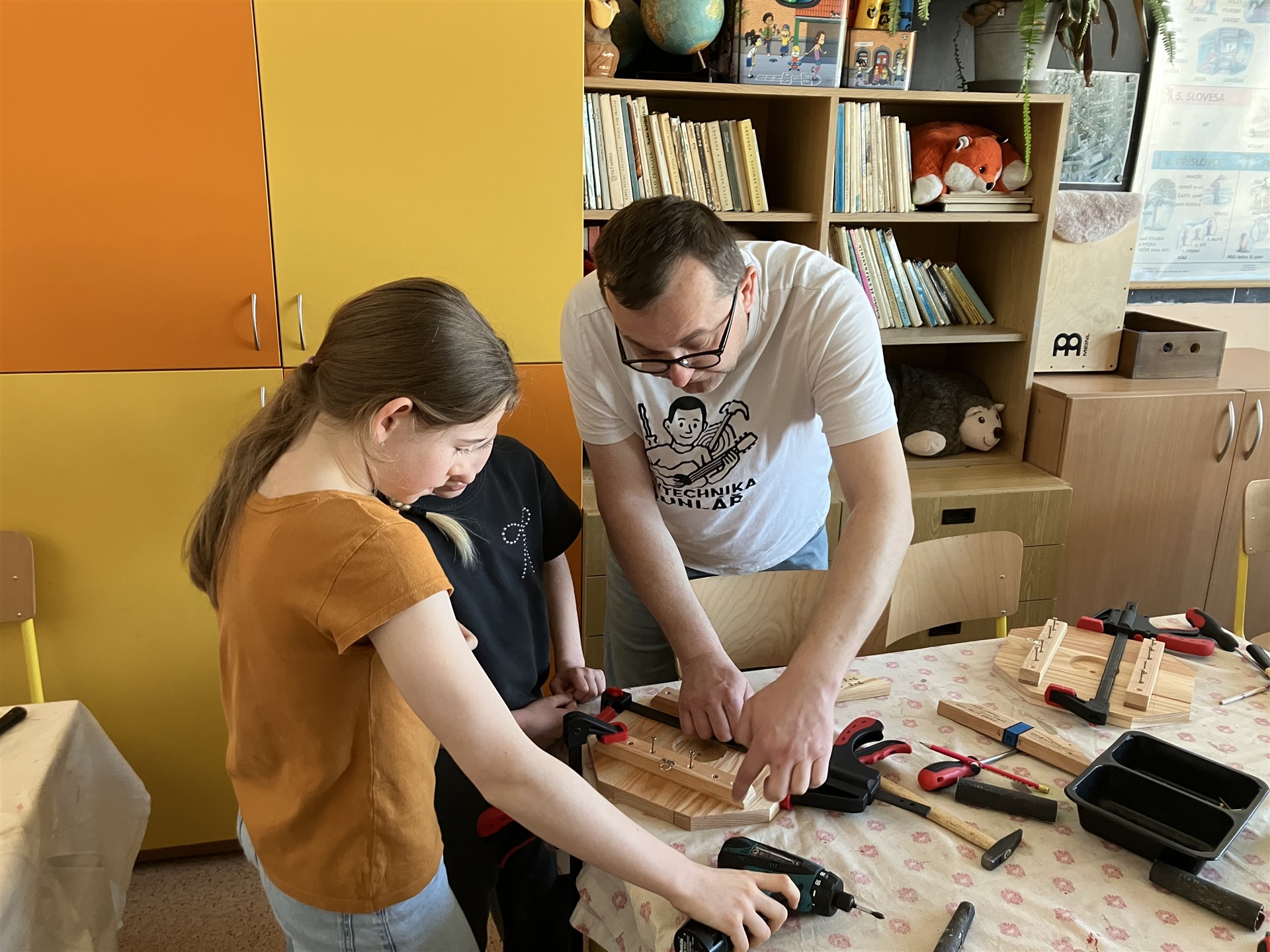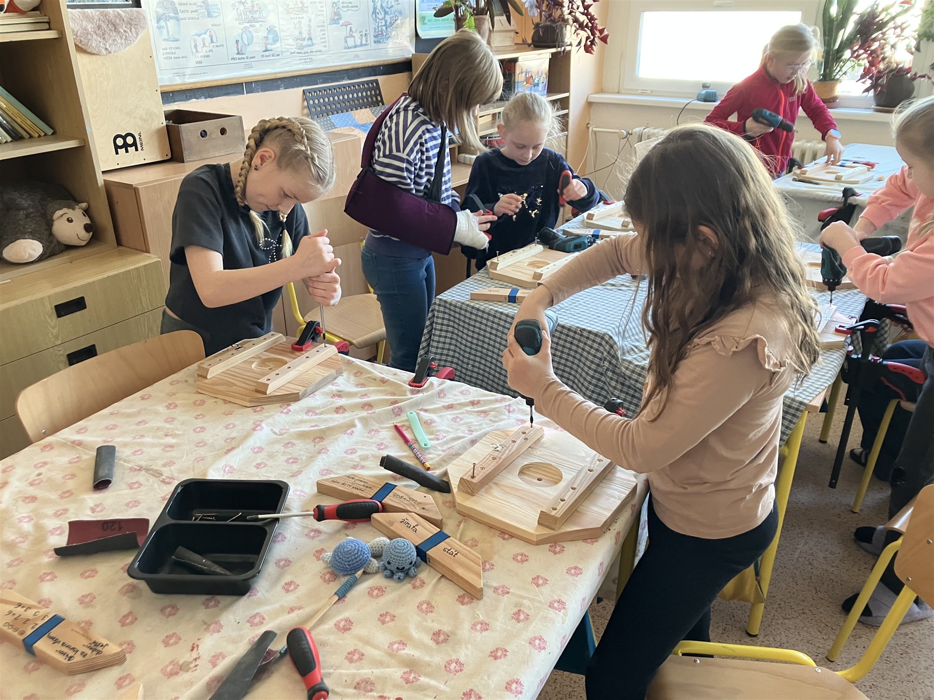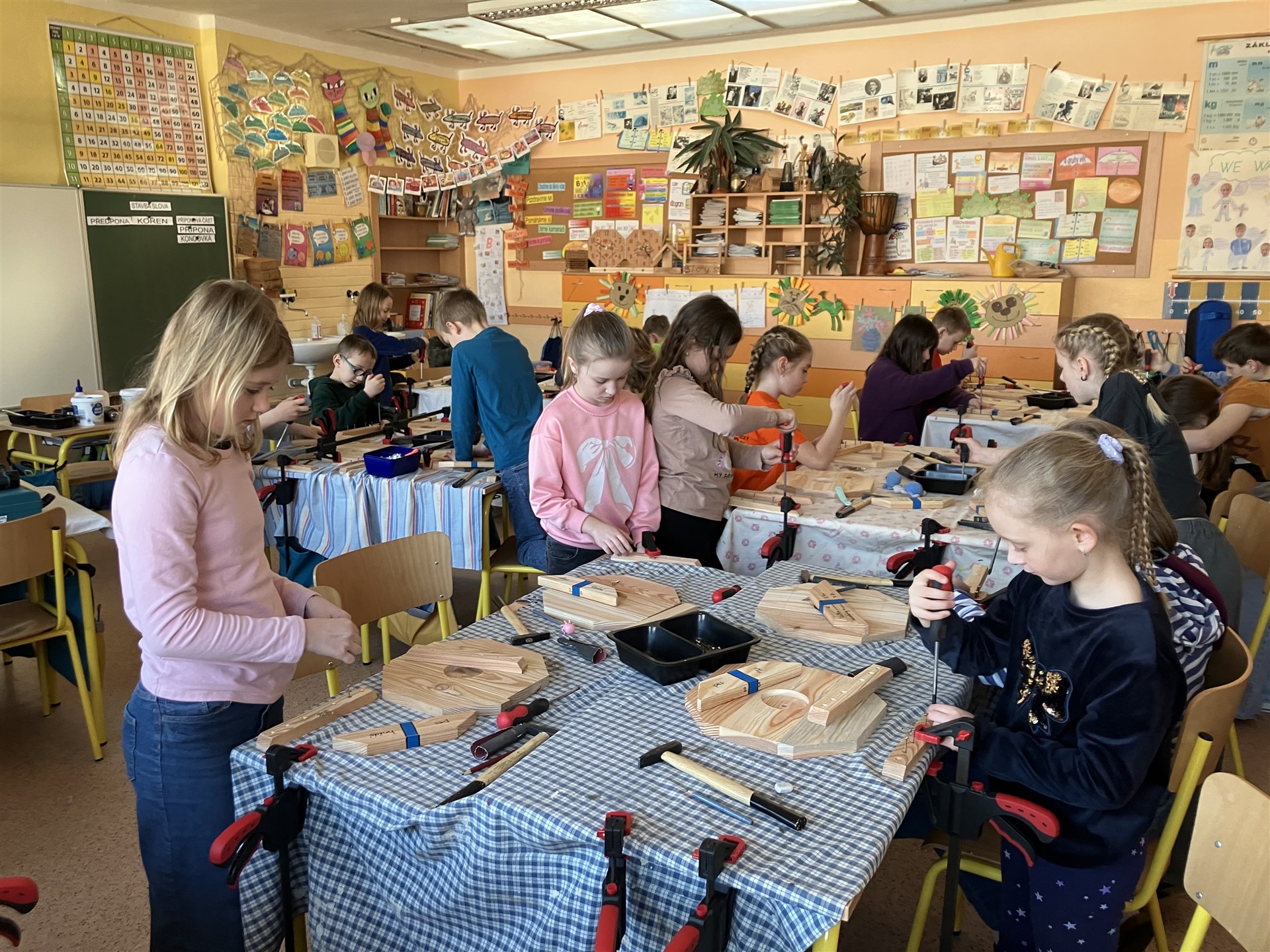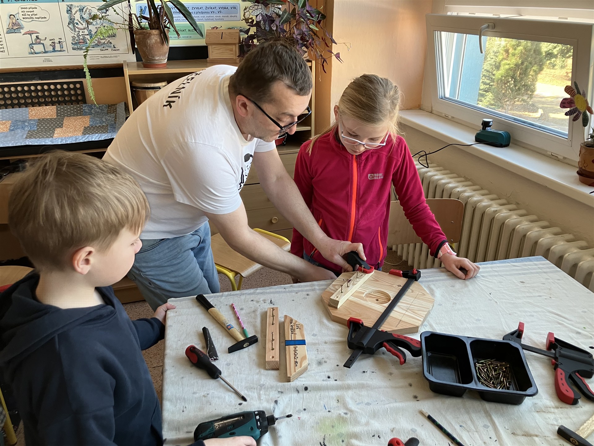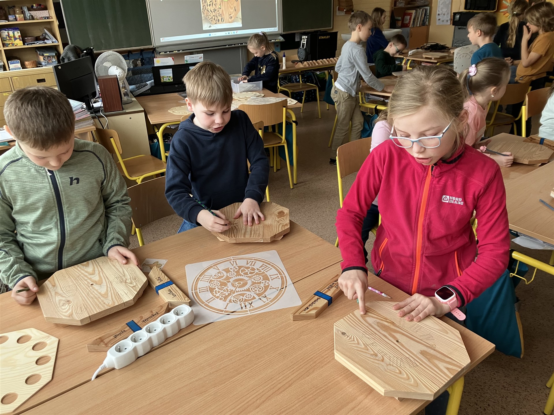 Ve středu 1. 4. 2026 přijel za dětmi ze 3. C pan truhlář Petr Kaněra, přivezl s sebou truhlářské nářadí a připravené jednotlivé díly z modřínového dřeva na výrobu hodin. Pod jeho vedením si žáci díly spojili, nazdobili, vložili si hodinový strojek i s baterkou, připevnili si hodinové ručičky. Děti se k dílu stavěly velmi pozorně, zodpovědně i šikovně, všechny si přály, aby se jim dílo povedlo a aby se jejich hodiny líbily, protože se těšily, až je doma zavěsí. Práce se dřevem se nám všem líbila a mnoho nás naučila. Mgr. Kamila Dariusová
