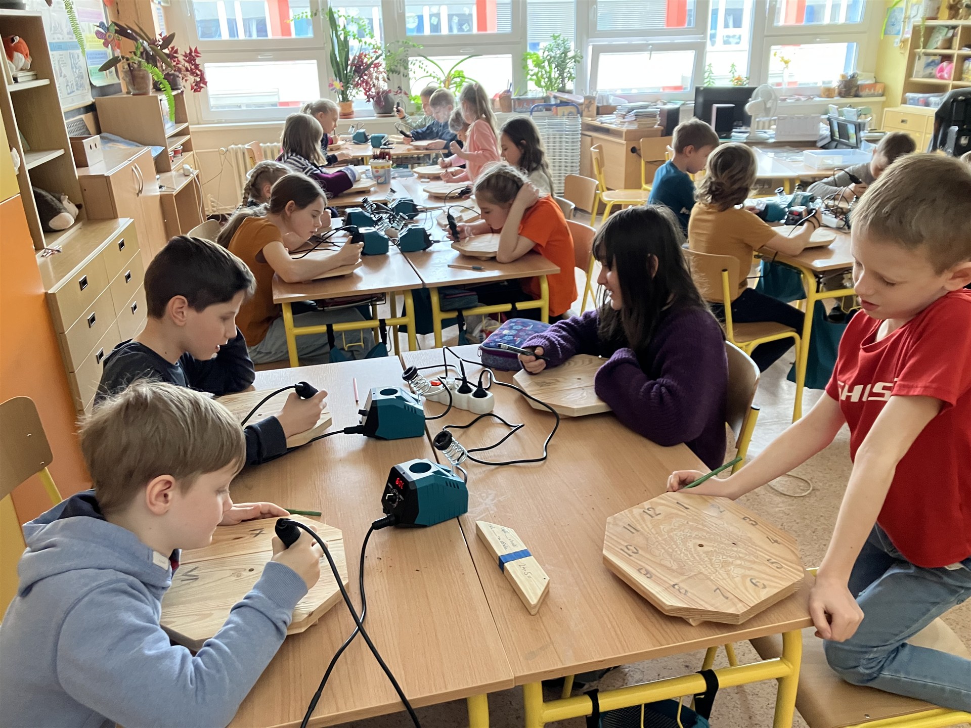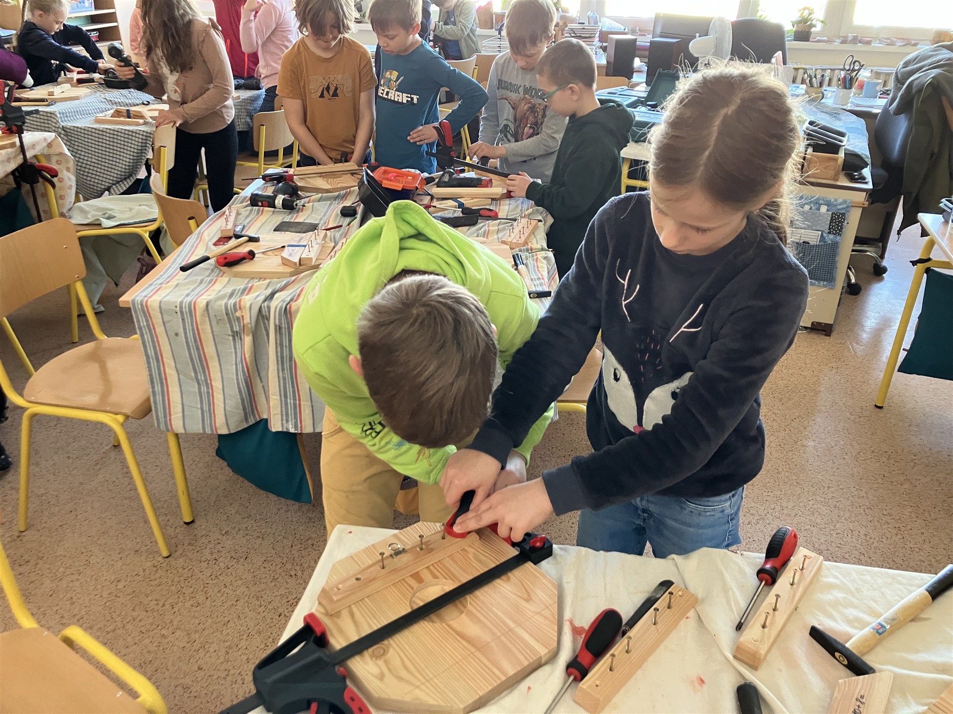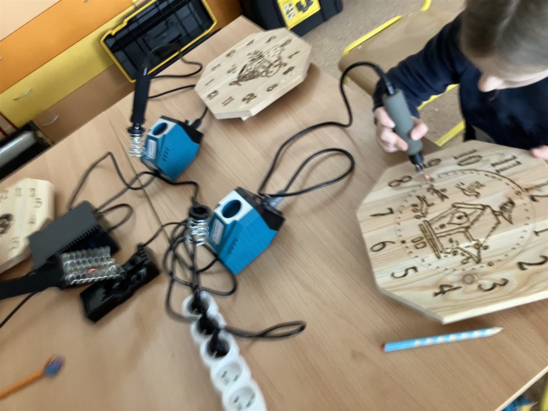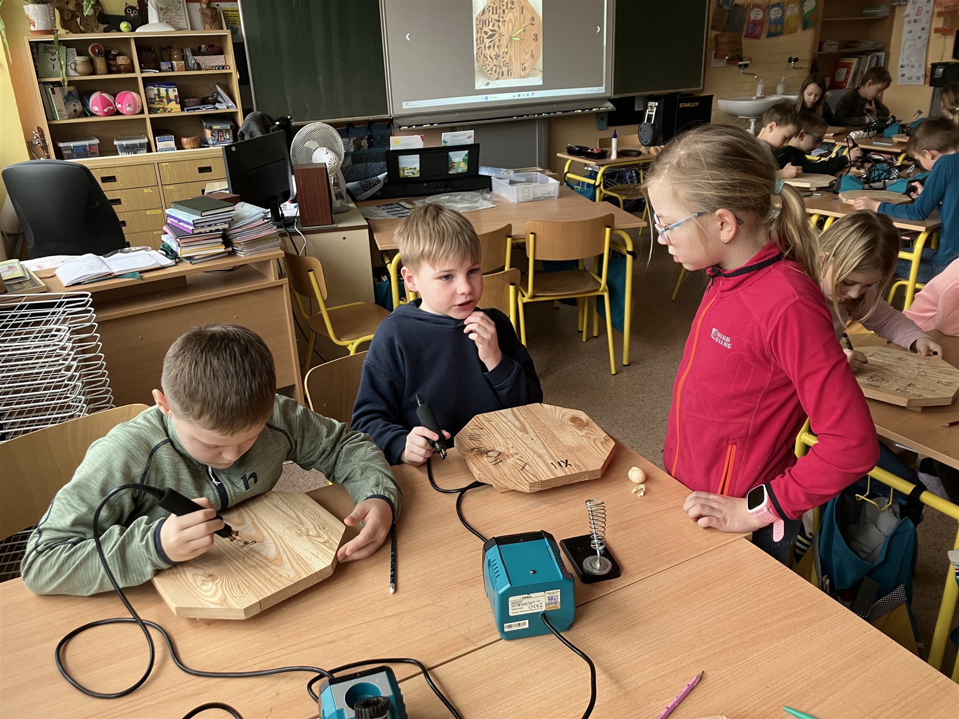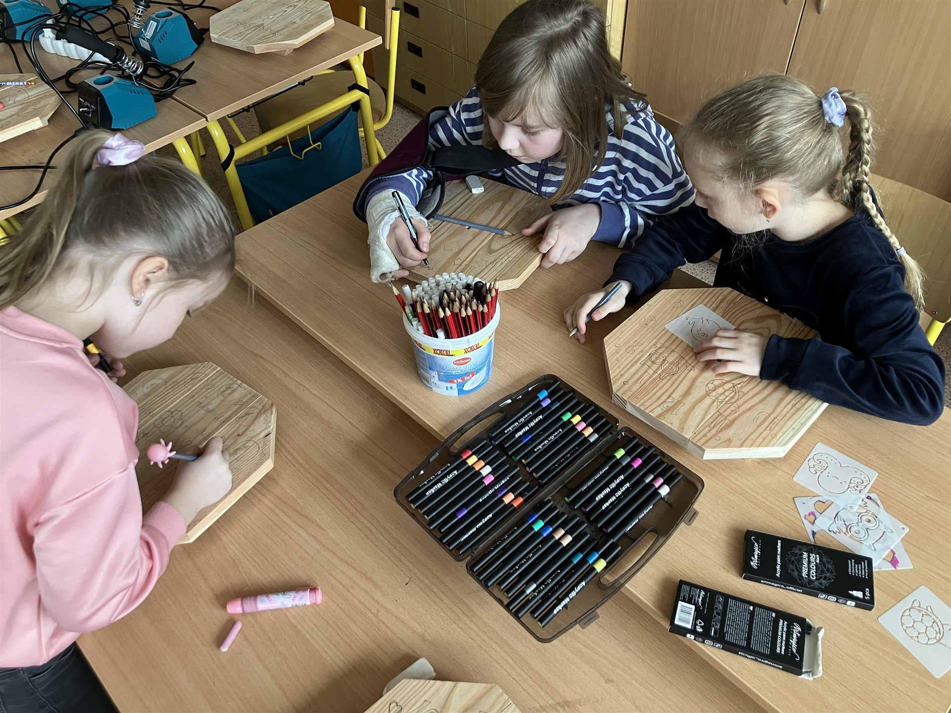Ve středu 1. 4. 2026 přijel za dětmi ze 3. C pan truhlář Petr Kaněra, přivezl s sebou truhlářské nářadí a připravené jednotlivé díly z modřínového dřeva na výrobu hodin. Pod jeho vedením si žáci díly spojili, nazdobili, vložili si hodinový strojek i s baterkou, připevnili si hodinové ručičky. Děti se k dílu stavěly velmi pozorně, zodpovědně i šikovně, všechny si přály, aby se jim dílo povedlo a aby se jejich hodiny líbily, protože se těšily, až je doma zavěsí. Práce se dřevem se nám všem líbila a mnoho nás naučila. Mgr. Kamila Dariusová